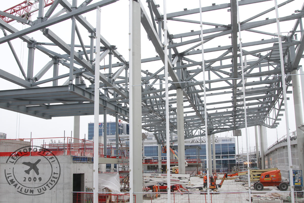 Sisävalmistusvaiheessa on puolestaan laajennukseen tuleva uusi turvatarkastusalue, sillä sen vesikatto on jo paikallaan. Kaikkiaan noin 100 metrin levyinen turvatarkastusalue on keskustakirjasto Oodin yläkerran kokoinen.
