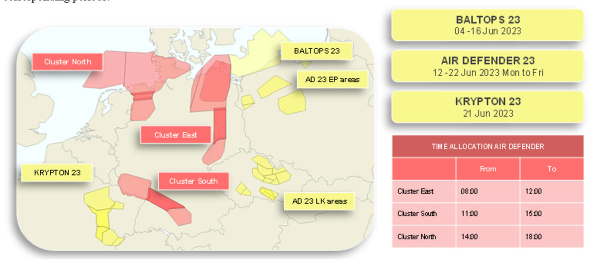 Laajalle alueelle Euroopassa asettuva Air Defender 23 -lentotoimintaharjoitus käynnistyi maanantaina 12. kesäkuuta ja jatkuu aikna 22. kesäkuuta 2023 saakka. Harjoitus on tauolla viikonloppuna 17.-18. kesäkuuta. Laaja Air Defender 23 -harjoitus aiheuttaa jo yksin sääntelyä lentoliikenteelle koko harjoitusajan. Osittain samaan aikaan Euroopassa järjestetään myös toinen Naton harjoitus Baltops 23 sekä Ranskan sotaharjoitus Krypton 23. Kyseiset harjoitukset tuovat yhdessä vaikutuksia myös kaupalliselle ilmaliikenteelle. Vaikutukset ovat laajat, mutta harjoitukset eivät kuitenkaan johda lentojen perumisiin.