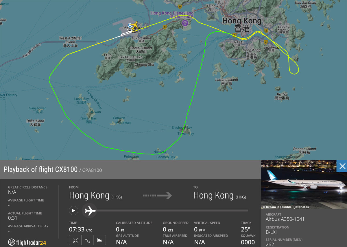 Cathay Pacifin Airbus A350-1000 -laajarunkokone lensi sunnuntai-iltapäivällä 30. maaliskuuta paikallislennon Hongkongissa Centralin, Wan Chain, Kai Tak Stadiumin, North Pointin ja Victoria Harbourin yli.
