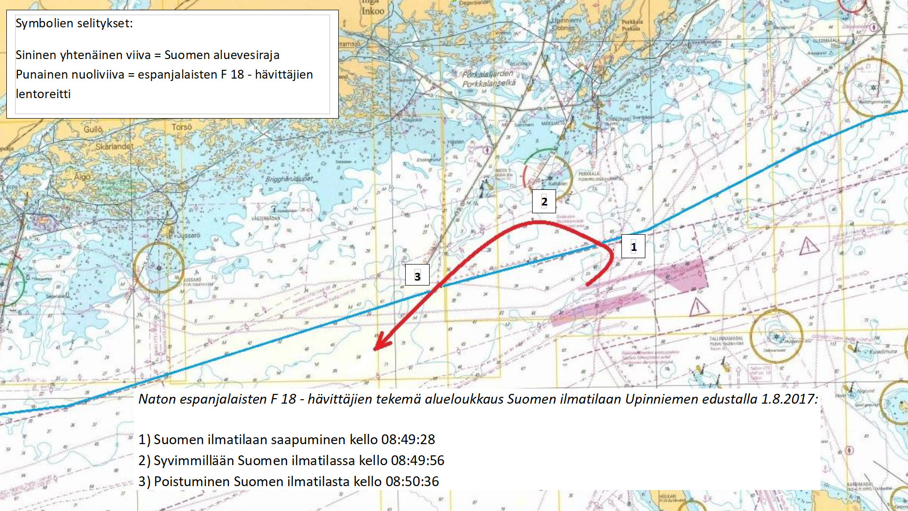 Rajavartiolaitos on saanut valmiiksi 1. elokuuta 2017 Upinniemen eteläpuolella tapahtuneen alueloukkauksen esitutkinnan. Tutkinnan mukaan kaksi espanjalaista McDonnell Douglas (Boeing) F/A-18 Hornet -hävittäjää loukkasi Suomen ilmatilaa. Syyttäjä on päättänyt lopettaa esitutkinnan.