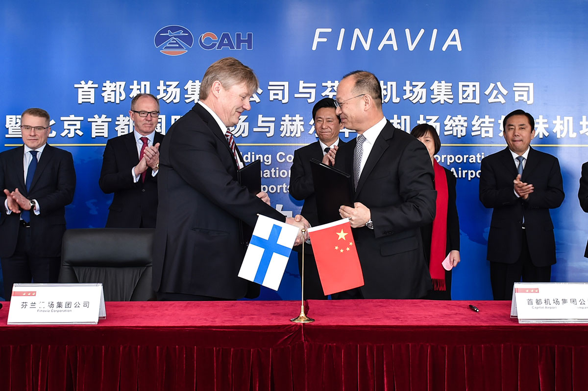 Finavia ja kiinalainen Capital Airports Holding Company (CAH) tiivistävät yhteistyötään. Torstaina 7. tammikuuta 2016 Pekingissä solmittu Memorandum of Understanding on the Establishment of A Sister Airport Relationship -sopimus (MOU) vahvistaa maiden ja lentoasemien välisiä suhteita ja antaa osapuolille mahdollisuuden kehittää yhteyksiä Suomen ja Kiinan sekä erityisesti Helsingin ja Pekingin välillä.