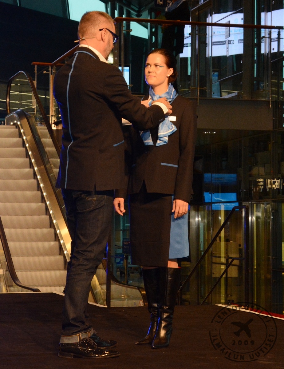 Asut suunnitelleen Touchpointin mukaan nyt esitellyissä vaatteissa uutta on koko mallisto, vanhaa ylijäämäkankaan hyödyntäminen, sinistä värimaailma ja lainattua kiitotiekuosi. Tämän hääkuvioista tutun yhdistelmän innoittamana uusien asujen muotinäytöksen päätti portaita alas lähtöaulaan askeltanut morsiuspukua kantava malli. Hänenkin asunsa oli kierrätysmateriaaleista koottu, mutta se ei sentään kuulu Finavian uuteen puvustoon. Lopuksi häätyyliin heitetyn kukkakimpun nappasi näytöstä katsomaan pysähtynyt matkustaja.