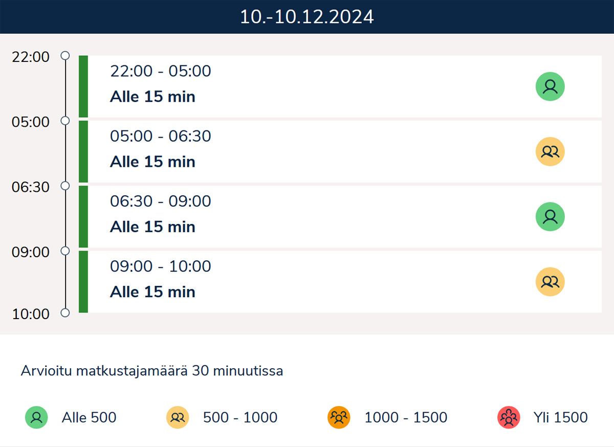 ”Helsinki-Vantaan lentoaseman palveluita ja asiakaskokemusta kehitetään datalähtöisesti. Nyt pilotoitavan jonotusajan ennusteen tavoitteena on kehittää turvatarkastuksen asiakaskokemusta ja sujuvaa matkustamista entisestään. Keräämme palvelun käyttäjiltä aktiivisesti palautetta sivustolla olevan palautelomakkeen kautta", sanoi Finavian Helsinki-Vantaan matkustajapalveluista vastaava johtaja Hanna Hämäläinen. Matkustajat voivat tarkistaa turvatarkastuksen jonotusajan ennusteen ennen lentoasemalle saapumista. Finavia on lisännyt ennusteeseen myös tiedon matkalle lähtevien matkustajien määrästä 30 minuutin välein.