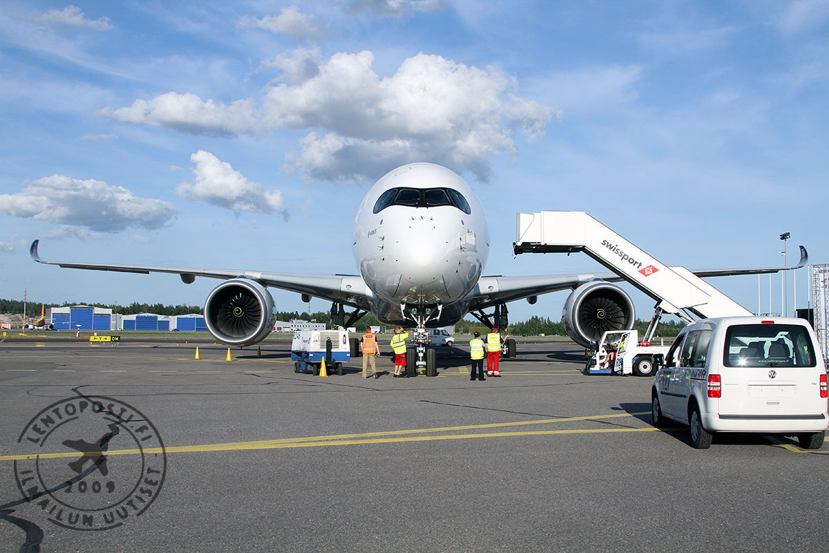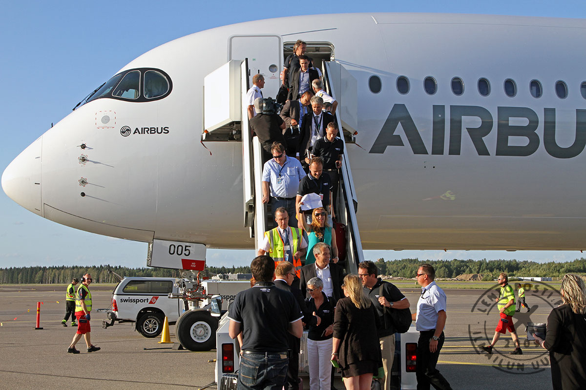 A350 saapui Helsinki-Vantaalle Moskovasta. Reitti tosin kulki ensin Pietarin kautta aina Tukholman ylle ja sieltä Suomeen. Ennen laskeutumista Helsinki-Vantaalle kone vielä teki muutamia ylimääräisiä kaarroksia. Helsinki-Vantaan pelastusajoneuvot antoivat erityiselle vieraalle perinteisen ja asiaankuuluvan tervehdyksen eli vesisuihkukäytävän. VIP-terminaalilla vierasta oli vastassa punainen matto ja Airbusin portailtakin vilkutettiin Suomen lipulla.