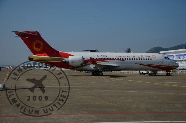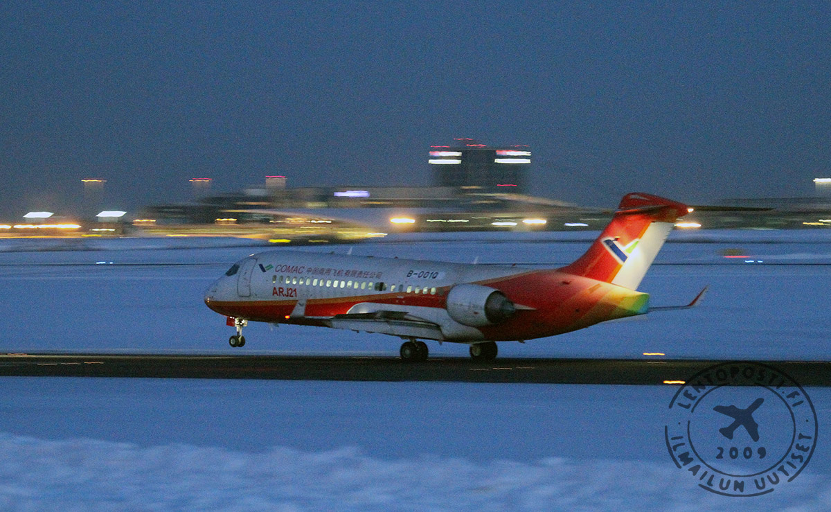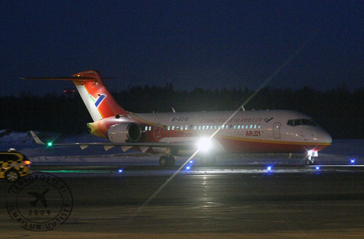 Lennonseurantapalvelu Flightradar24:ssä vaikutti Helsinki-Vantaata aluksi lähestyvän toisenlainen poikkeuksellinen vieras. Palvelu näytti koneen olevan Shanghai Airlinesin Boeing 737. Kiinan COMAC:n (Commercial Aircraft Corporation of China, Ltd) kehittämä ja valmistama ARJ21 Xiangfeng on maan ensimmäinen oma matkustajalentokone. Hanke käynnistyi vuonna 2002 ja ensilento oli suunniteltu vuodelle 2005. Useiden muiden lentokoneohjelmien tavoin ensilento viivästyi ja tapahtyi vasta 2008.