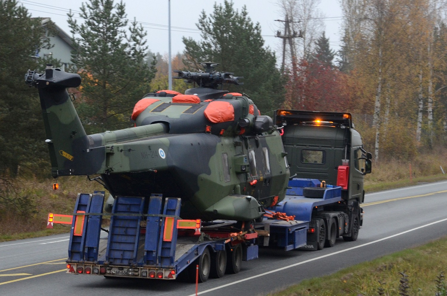 Lavetilla voidaan kuljettaa Hornetin ohella muitakin koneita. Niihin kuuluvat myös historialliset Morane-Saulnier M.S.50C ja Messerschmitt 109 -hävittäjät, joita on siirretty museoiden välillä (lue tarkemmin linkeistä jutun lopussa). Yllä olevassa kuvassa kyseisellä kuorma-auton hinaamalla lavetilla kuljetetaan NH90-kopteria, jonka roottorimekanismin lepatuksen rajoitin vaurioitui Säkylässä vuonna 2014.