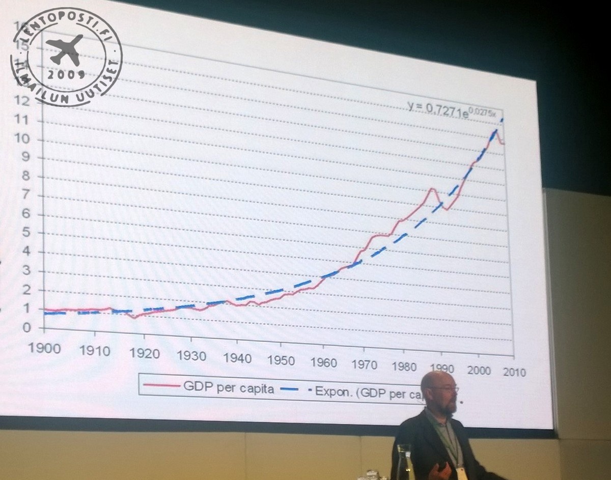 Hän linjasi, että jo pitkään povattuja, "aivan lähitulevaisuudessa" käyttöön tulevia lentäviä autoja on turha odottaa. Sen sijaan esimerkiksi avaruuslogistiikassa alkaa pian olla business-mahdollisuuksia myös Suomessa. Lisäksi professori Valtaoja muistutti, että menneet vuosikymmenet - vaikka monet niiitä haikailevatkin - eivät oikeasti olleet nykypäivää parempia, päinvastoin. Vielä sata vuotta sitten Suomessakin kuoltiin nälkään. Merkittävä osa ihmiskuntaa elää juuri tänään historian parasta ja vaurainta aikaa (grafiikka yllä), Valtaoja todisti. Tämä tieto oli hyvä päätös seminaarille. T.T. Lue Lentoposti.fi -juttuja seminaairin ilmailuaiheista: