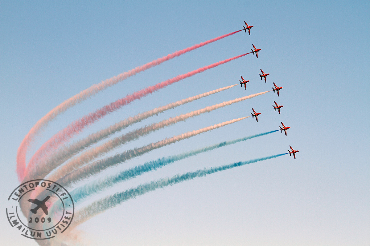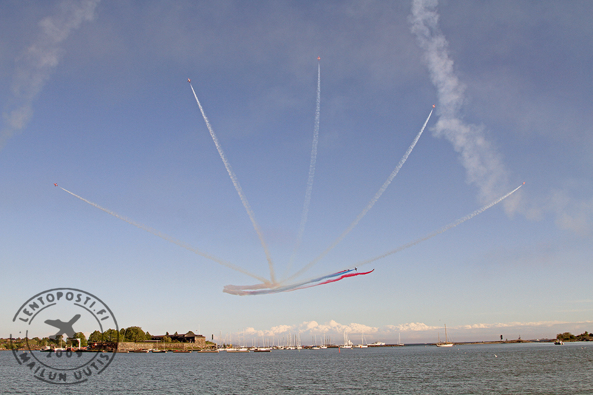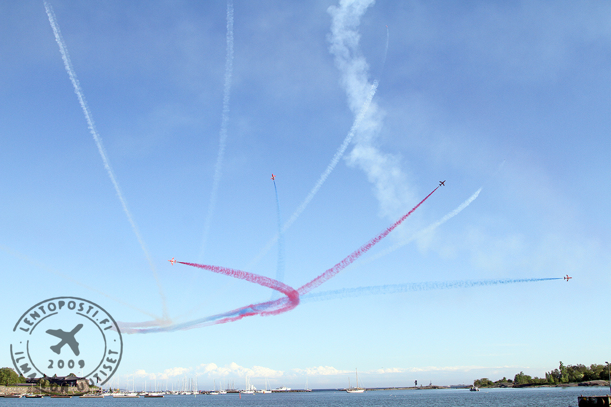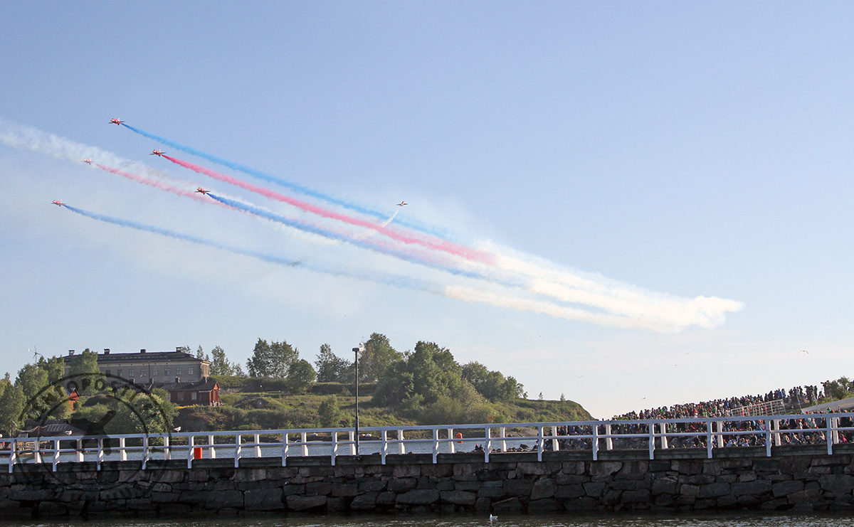 Kyseessä on maailmanluokan osastotaitolentoryhmä, joka on juuri käyttänyt kaksi kuukautta Kyproksella ohjelmaansa harjoitellen. Ja se näkyy. Taivaalla tapahtui koko ajan. Lentonäytöskävijöitä hemmoteltiin tiukasti lennetyillä muodostelmilla, hajoituksilla, kohtaamisilla ja tietysti savuilla piirretyllä perinteisellä nuolen lävistämällä sydämellä. Ohjelmansa lopuksi Redsit tekivät upean ohilennon vetäen sini-valkoisia savuja Suomi 100 -juhlavuoden kunniaksi (kuvassa yllä). Yleisö puhkesi sponttaaneihin aplodeihin. Kun Red Arrows oli tulossa esityksensä jälkeen laskuun Helsinki-Vantaan lentoasemalle, lennonjohto mahdollisti vielä ylilennon,. Se päättyi näyttävään Spaghetti Break -hajoitukseen. Britannian suurlähetystössä illan päätteeksi järjestetyssä vastaanotossa Redsien lentäjät erikseen kiittelivät lennonjohdon toimintaa.