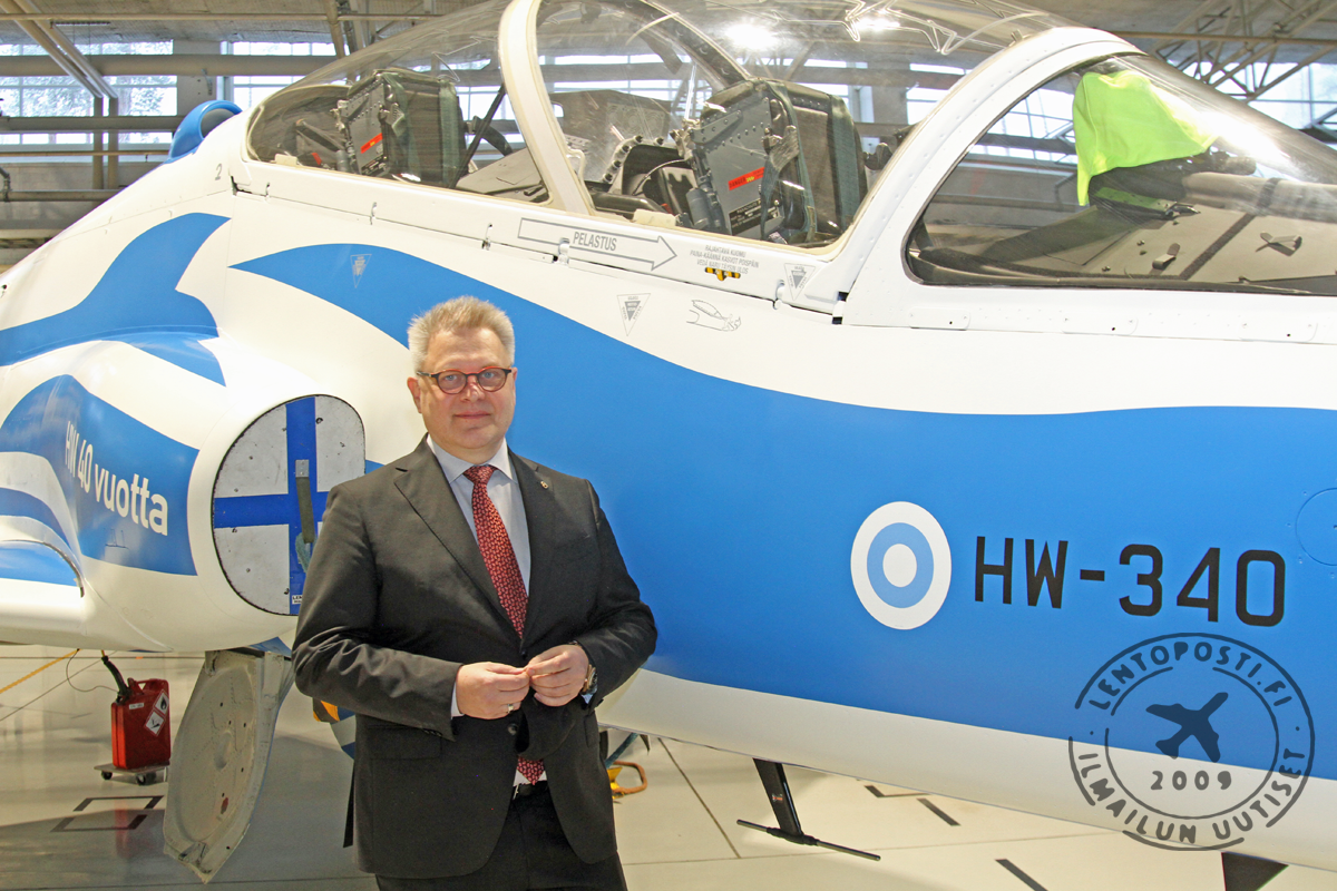 Ilmavoimat juhlistaa BAE Systems Hawkien 40-vuotista lentoa Suomessa näyttävästi erikoismaalatulla Hawk-suihkuharjoituskoneella. Juuri modifikaatiosta valmistunut Hawk Mk51 HW-340 on saanut pintaansa sinivalkoiset värit ja koneyksilö esiteltiin juhlatilaisuudessa Tikkakoskella.