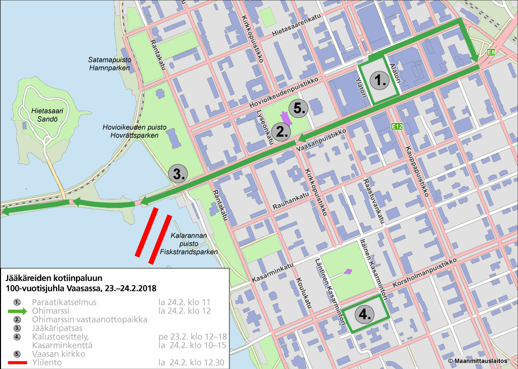 la 24.2. klo 11 Paraatikatselmus Kauppatorilla la 24.2. klo 12 Ohimarssi Vaasanpuistikossa kohti Jääkäripatsasta la 24.2. klo 12.30 Näytöslento eteläisellä kaupunginselällä, säävaraus