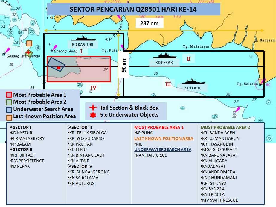 Indonesian merivoimien mukaan myöskään tallentimien lähettämiä akustisia paikannussignaaleja ei ole nyt havaittu. Perärunkoon kuuluvien osien nosto kuitenkin kertoo siitä, että etsintäalue on oikea. Työt jatkuvat sunnuntaina. Operaation 14. päivän vedenalaisten ja pintaetsintöjen alueet ja niille sijoitetut alukset ilmenevät oheisesta kartasta. Kuva Airbusin perärungon osasta kuljetusalukselle nostettuna: Turun Sanomat (avautuu klikkaamalla suuremmaksi) Linkki Associated Pressin videoon