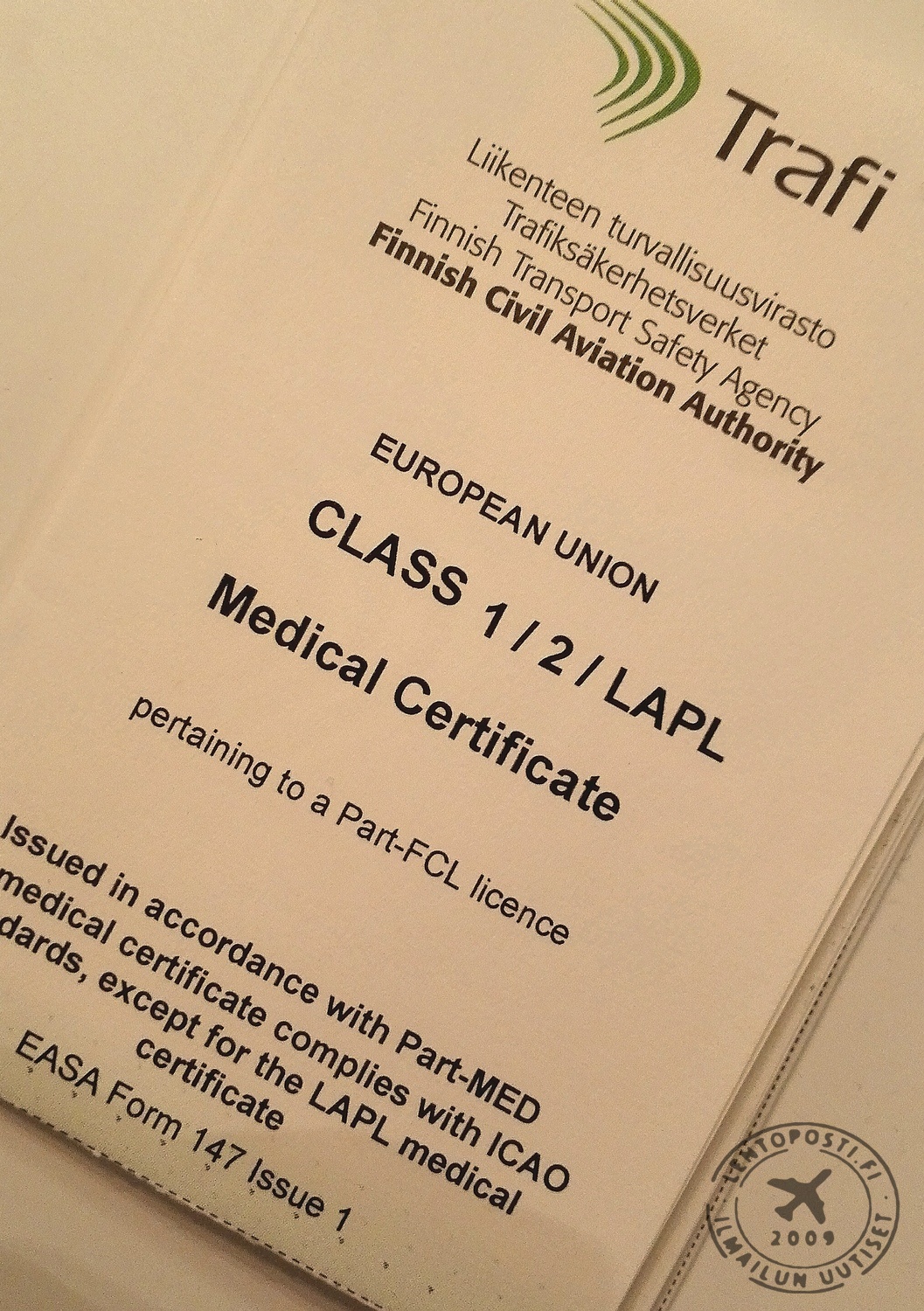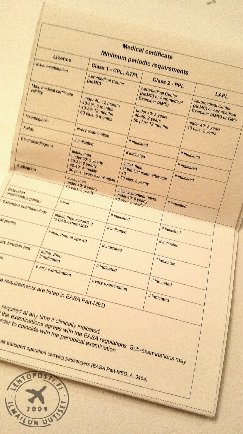 Lisäksi on kevyiden ilma-alusten lupakirjaluokka 4 LAPL (Light Aircraft Pilot Licence). Lentäjällä voi olla voimassa vain yksi medikaali kerrallaan, joten luokka 1 sisältää myös luokan 2 ja LAPL:n (otsikkokuvassa). Luokan 1 kelpoisuustodistuksen myöntää Ilmailulääketieteen keskus, joka vanhastaan tunnetaan Psykona. Medikaalin voimassaoloa voi jatkaa myös ilmailulääkäri. Luokan 1 kelpoisuus on voimassa 12 kuukautta. Kaupallisessa lentokuljetuksessa yhden ohjaajan miehistöllä toimittaessa yli 40-vuotiaalla ja kaikilla 60 vuoden iän ylittäneiltä tarkastusväli on kuusi kuukautta. T.T. Ilta-Sanomien pääministerin haastattelu Helsingin Sanomien uutinen Lue myös: