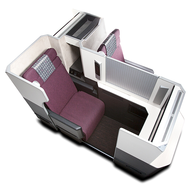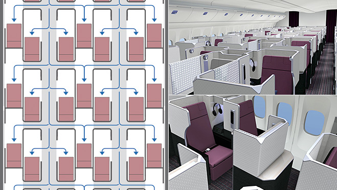 JAL:n 787-8 Dreamlinerin Sky Suite business-luokassa istuinjärjestely on 2-2-2. Tilavat omat sopet laskeutuvat noin 188 cm pitkiksi ja 65 cm leveiksi sängyiksi.