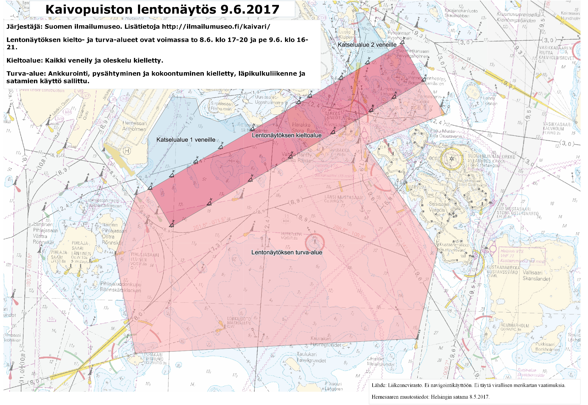 Turva-alueella ankkurointi, pysähtyminen ja alusten kokoontuminen on kuitenkin kielletty ilman lentonäytöksen järjestäjän lupaa. Lentonäytöksen merialueen valvonnan ja pelastusvalmiuden tehtävissä on mukana sekä Suomen meripelastusseuran jäsenyhdistysten että Turvallisesti vesillä ry:n aluskalustoa. Nämä lentonäytöksen kielto- ja turva-alueet ovat voimassa torstaina 8.6. kello 17.00 - 20.00 sekä perjantaina 9.6. kello 16.00 - 21.00. Lentonäytöstä veneellä seuraamaan saapuville on osoitettu kaksi katselualuetta, joihin järjestäjä pyytää katsojien saapuvan perjantaina 9.6. vasta kello 15.00 jälkeen.
