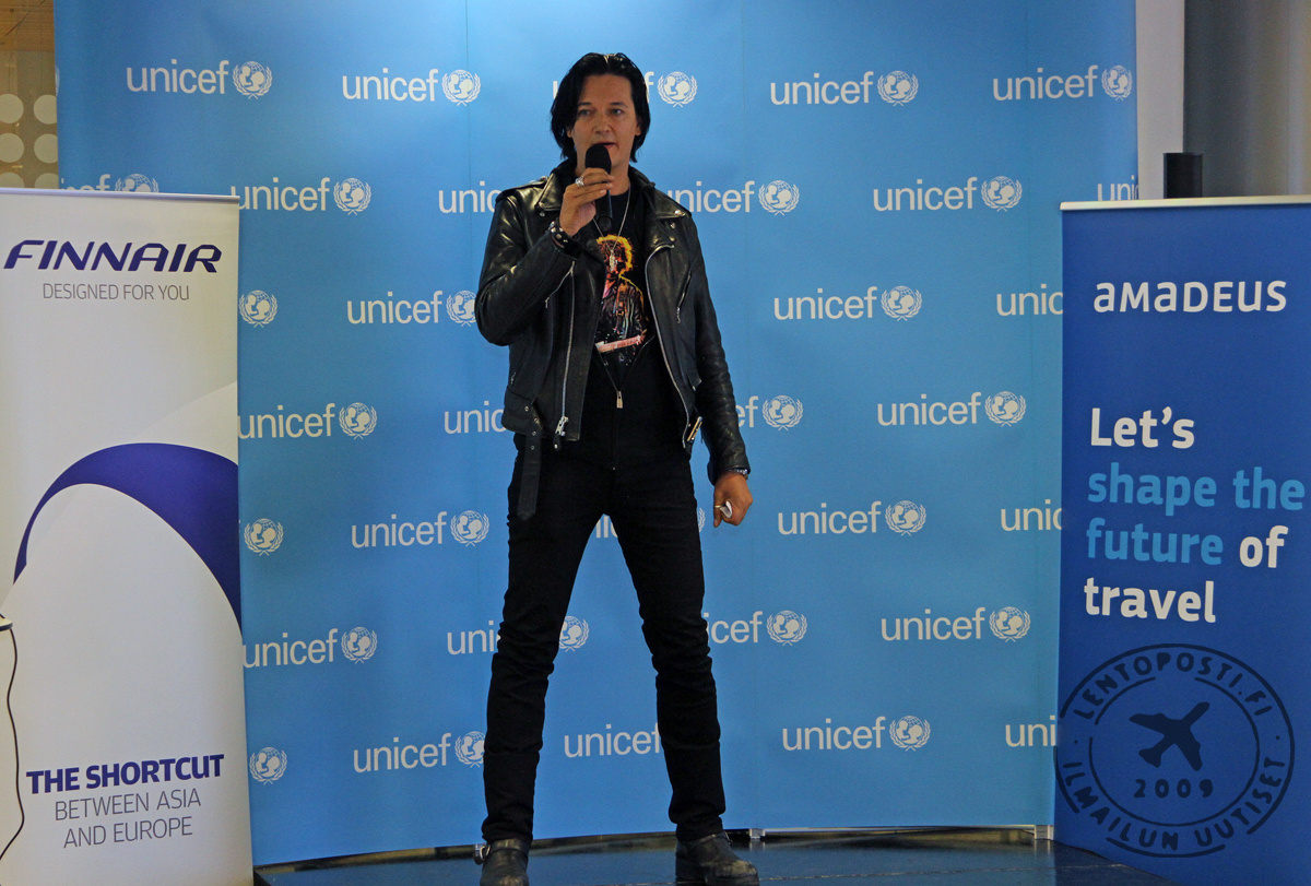 Lentovarauksen yhteyteen siirrettävän keräyksen julkistamistilaisuudessa oli mukana myös The 69 Eyes-yhtyeen Jyrki 69, joka on toiminut UNICEF:n hyväntahdonlähettiläänä jo lähes kymmenen vuotta. Jyrki 69 kertoi työskennelleensä Finnairilla tiskaajana ennen rock-uraansa.