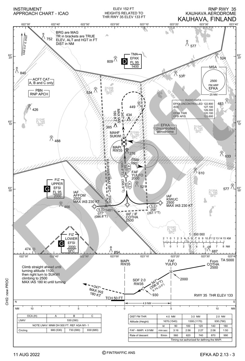 Syksyllä 2020 Kauhavan lentopaikan hanke eteni yhteydenotolla lennonvarmistuspalveluja Suomessa tarjoavaan ANS Finlandiin (nyk. Fintraffic ANS). Tavoitteena oli saada Kauhavan lentopaikalla RNP-lähestymismenetelmät (Required Navigation Performance). Ensimmäiset luonnokset uusista RNP-lähestymismenetelmistä LNAV-minimein laadittiin alkuvuodesta 2021.Tavoitetila oli saada menetelmät käyttöön jo kesällä 2021. Hanke viivästyi kuitenkin reilulla vuodella, sillä kaikkia tarvittavia säädöksiä ei vielä oltu päivitetty tai julkaistu. Nyt voimaan on astunut muutoksia koskien EU-asetuksia, ilmailulakia kuin kansallisia ilmailumääräyksiä.