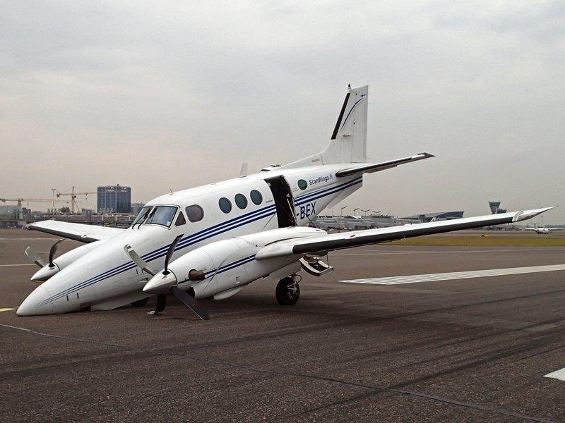 King Air -potkuriturbiinikone lähti rahtilennolle Helsinki-Vantaan lentoasemalta Ruotsin Örebrohon 26.8.2015. Koneessa oli kahden hengen miehistö ja rahtina lääkeaineita. Muita henkilöitä ei ollut koneessa. OTKES:n turvallisuustutkimuksen mukaan kone oli lähdettäessä lentokelpoisuutta koskevien vaatimusten mukaisesti lentokelpoinen, ohjaajat asianmukaisesti koulutettuja, ja heidän lupakirjansa ja kelpoisuutensa voimassa. Kun ohjaajat valitsivat laskutelineen lentoonlähdön jälkeen ylös, kuului nokkatelineestä normaalista poikkeava rusahdus. Merkkivalo osoitti, että laskuteline ei ollut tullut normaalisti sisään. Ohjaajat tekivät hätätoimenpideohjeistuksen mukaiset toimenpiteet, mutta nokkatelineen alaslukittumista osoittava merkkivalo ei syttynyt. Sen sijaan telineen liikkeestä kertova "Gear in transit" -valo jäi palamaan. Ohjaajat päättivät palata takaisin lähtökentälle. Laskeutumisen yhteydessä lentokoneen nokka painu kiitotiehen ja liukui maata pitkin noin 500 metriä. Nokka, laskutelineluukut ja potkurit vaurioituivat. Lentoaseman pelastustoimi oli valmiudessa kiitotien läheisyydessä. King Airin nokkatelineen käyttölaite vaurioitui toimintakelvottomaksi, kun sen liikeruuvin mutterikierteet leikkautuivat irti telineitä sisään otettaessa. Leikkautuminen johtui pitkälle edenneestä kierteiden kuluneisuudesta, jolloin ne eivät lopulta enää kestäneet välitettyä voimaa. Huoltovaatimusten mukaisesti välystarkastus ja voitelu suoritetaan 1000 laskeutumisen tai 30 kuukauden välein. Vaurioituessaan käyttölaitteelle oli kirjattu noin 900 laskeutumista.