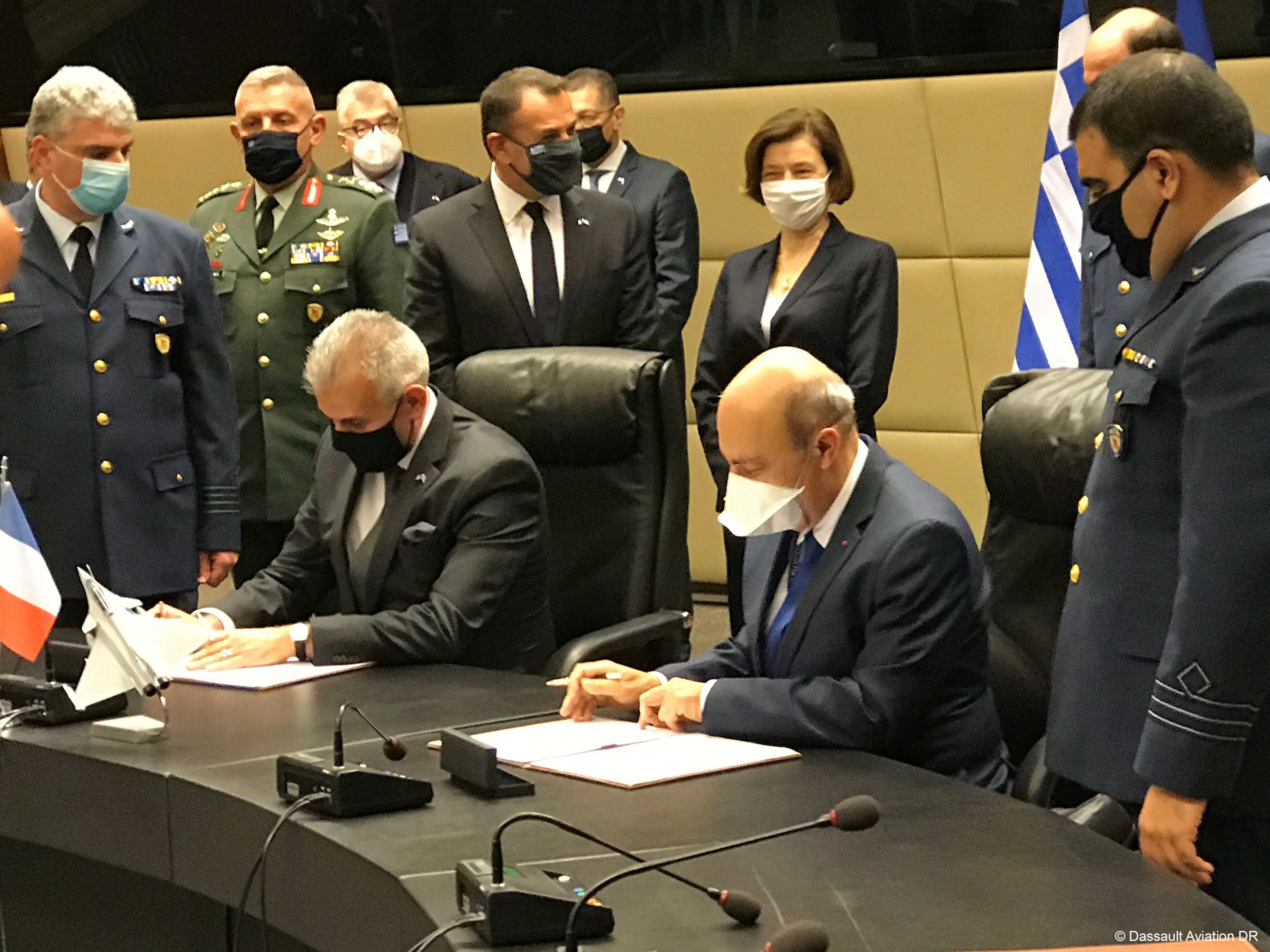 Sopimuksen allerkijoittivat Kreikan puolustusministeriön puolustushankinnoista vastaava johtaja Theodoros Lagios ja Dassault Aviationin hallituksen puheenjohtaja ja toimitusjohtaja Eric Trappier. Allekirjoitustilaisuudessa Ateenassa oli paikalla myös Thalesin, Safranin ja MBDA:n edustajien lisäksi mm. Ranskan puolustusministeri Florence Parly sekä Kreikan puolustusministeri Nikolaos Panagiotopolous.