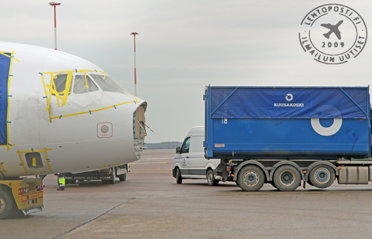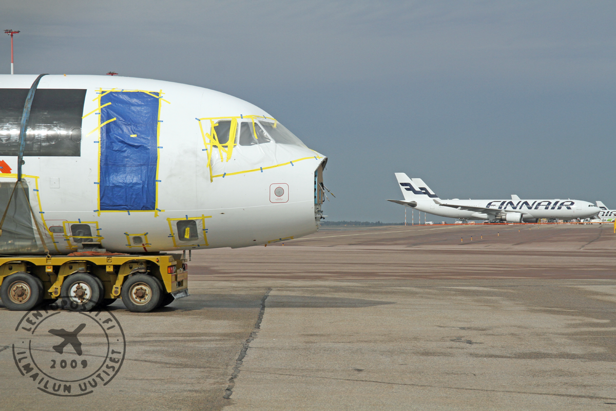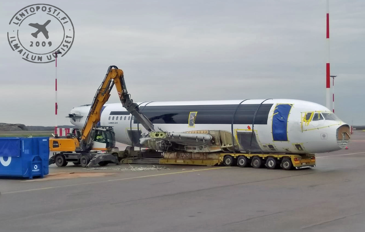 Helsinki-Vantaan lentoasemalla nähtiin ainakin toistaiseksi harvinainen operaatio, kun Finnairin käytöstä poistama Airbus A319 (OH-LVB) -matkustajakone purettiin lavetilla lopulliseen kuljetuskuntoon.