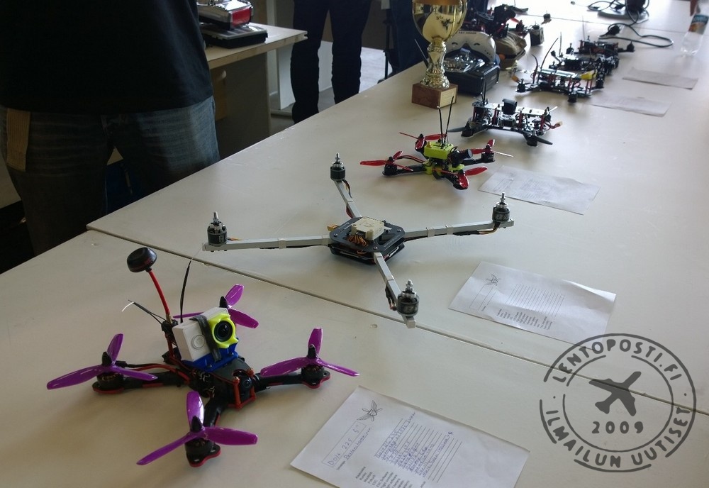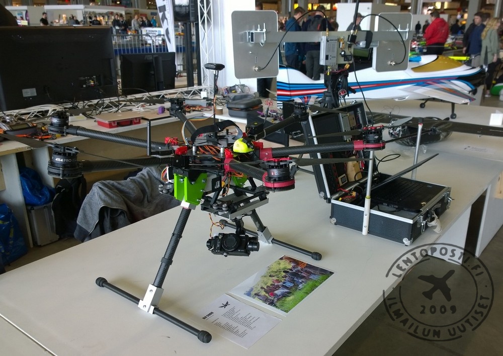 Kauko-ohjattavia kamerakoptereita on esillä enemmän kuin koskaan. Niitä on nähtävänä niin ammattimaiseen kuvaukseen soveltuvina (yllä), harrastekäyttöön riittävinä tai pelkkään hupilentelyyn käytettävinä. Lisäksi paikalla on FPV Racing -multikoptereita. Ne ovat pieniä kauko-ohjattavia, joita lennätetään kopterin kameran lähettämän kuvan perusteella (FPV, First Person View, kuvassa alla).