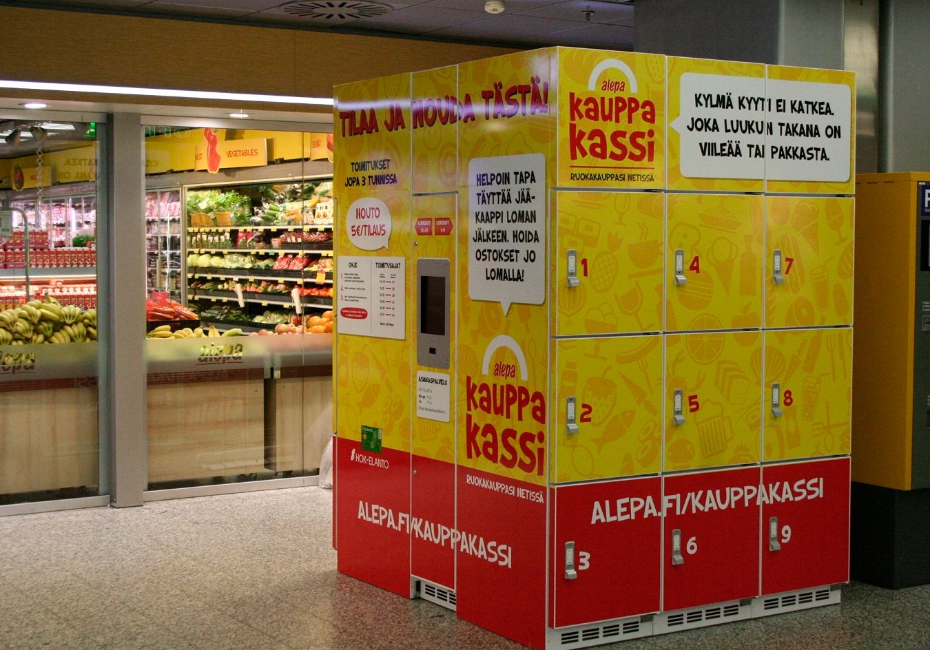 "Haluamme tehdä matkustuskokemuksesta helpon ja sujuvan kotiovelle saakka. Osana tätä kehitämme Helsinki-Vantaata voimakkaasti kauppapaikkana, jotta voimme vastata lentomatkustajien erilaisiin tarpeisiin", Finavian matkustajapalveluista vastaava johtaja Anne Gullstén kertoo. "Alepan Kauppakassi on loistava lisä jatkuvasti laajentuvaan palveluvalikoimaamme. On hienoa, että voimme tarjota asiakkaillemme jälleen uuden tavan asioida – ja vieläpä ensimmäisenä Pohjoismaissa", Gullstén iloitsee. Alepan Kauppakassi on Suomen suurin ja tunnetuin ruoan verkkokauppa. Asiakas valitsee verkkokaupasta haluamansa tuotteet ja noutoajan. Kun tuotteet on kerätty ja viety noutopisteen lokeroon, asiakas saa tekstiviestillä koodin, jolla lokero avautuu. Nouto onnistuu lähes vuorokauden ympäri, ja tuotteet on noudettavissa parhaimmillaan kolmen tunnin kuluttua tilauksesta. Ruokakassin noutopalvelu lentoasemilla vielä harvinaisuus HOK-Elannon verkkokaupan kehityspäällikkö Jukka Ranuan mukaan ruoan verkkokaupan noutopalveluiden kysyntä on kasvussa. Helsinki-Vantaa on ensimmäisiä lentoasemia, joka on reagoinut kysyntään. Pohjoismaiden lentoasemista se on ensimmäinen, josta palvelu pian löytyy.
