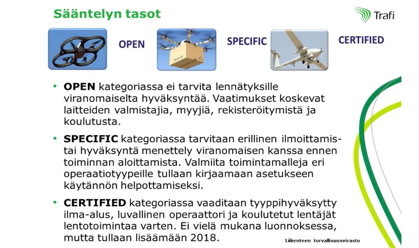 Lausuntokierroksella oleva EU:n RPAS-sääntely jakaa laitteet kolmeen luokkaan, jotka ovat Open, Specific ja Certified. Luvassa on teknisiä vaatimuksia kuten geofenching, ilma-alusten tunnistamista eli ns E-identificationia, nettikursseja ja rekisteröintiä, joka ei tosin koske pienimpiä laitteita. Sääntelyssä on vielä paljon määriteltävää mm. ihmisjoukon ja tiheästi asutun alueen suhteen.