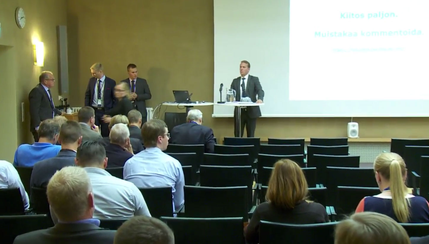 "Meidän on nyt hahmotettava tulevaisuutta eikä niinkään tätä päivää. Olemme tänä päivänä vasta drone-toiminnan ensimmäisellä portaalla jos edes silläkäään", sanoo Liikenteen turvallisuusvirasto Trafin Ilmailujohtaja Pekka Henttu sääntelytilaisuuden puheessaan.