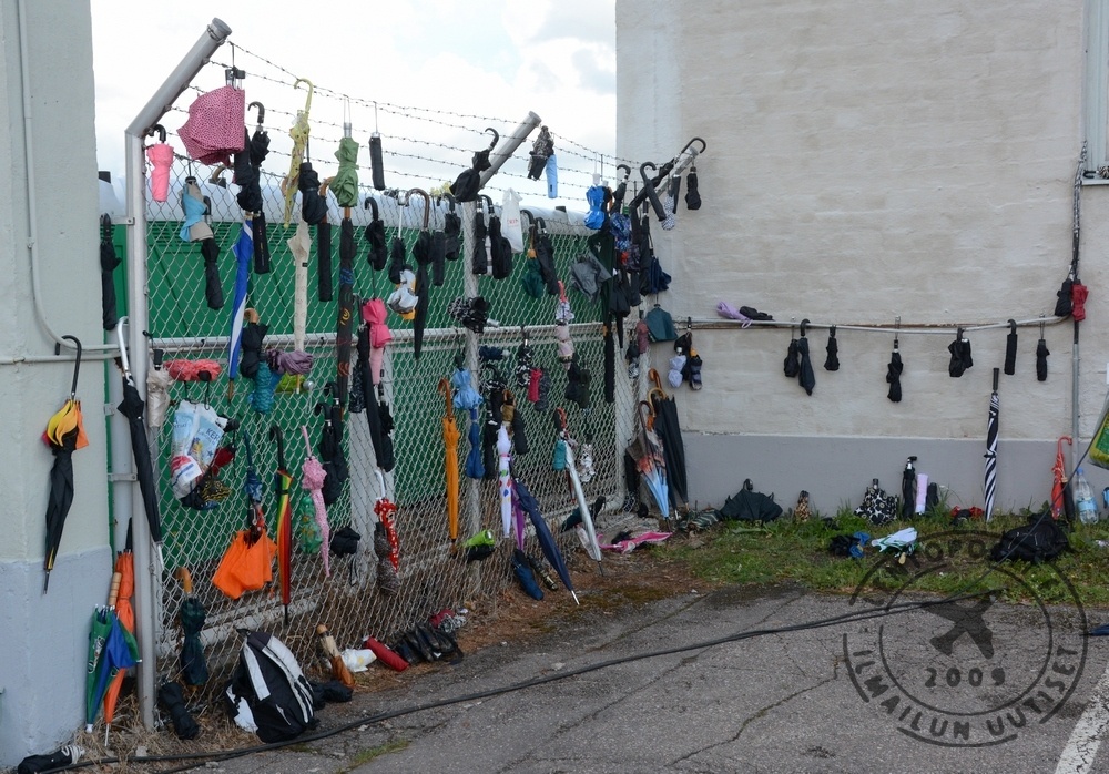 Turvatarkastuksessa löydettyjä sateenvarjoja varten oli portin vieressä parkki, johon ne saattoi jättää (kuva vasemmalla). Varjoja kertyikin päivän mittaan melkoinen valikoima. Lentokentän asematason portilla tehdyssä turvatarkastuksessa kasseihin ja reppuihin katsomisen ohella jopa housujen taskuja käytiin läpi. Kyseessä lienee ensimmäinen kerta suomalaisten lentonäytösten historiassa? Lipunmyynti lentoaseman pääportilla ruuhkautui pahoin tapahtuman avauduttua kello kymmeneltä. Pahimmillaan jono jatkui lentoaseman portilta Tattariharjuntielle ja vielä sitäkin pitkin. Eräät kävijät mainitsivat jopa tunnin jonotusaikoja. Myös aiemmin ostetut liput piti vaihtaa portilla rannekkeisiin, joten ennakointi ei nopeuttanut alueella pääsyä. Lisäksi jonot lipunmyyntiin ja lipun vaihtoon rannekkeeseen olivat menneet monelta sekaisin.