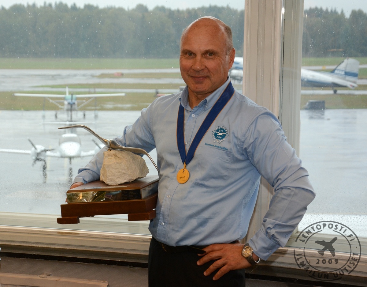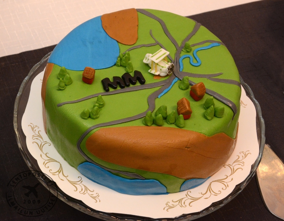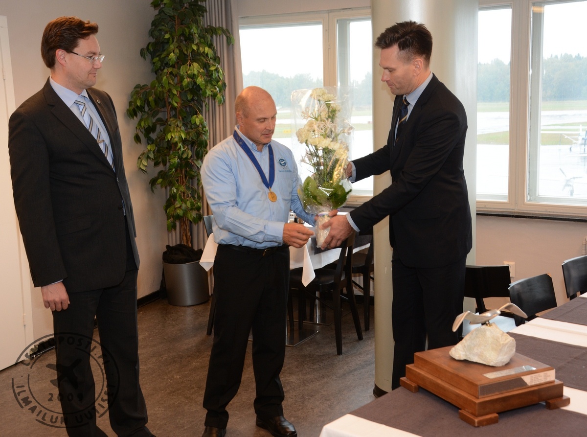 Perinteiset mitalikahvittelut järjestettiin Malmin lentoaseman Gate1-ravintolan kabinetissa, koska liiton omissa tiloissa oli meneillään vesivahingon jälkeinen remontti. Ravintolan keittiö oli loihtinut tarjoiluksi upean tarkkuuslentoaiheisen kakun (kuva alla, klikkaa suuremmaksi). Ilmailuliiton puheenjohtaja Petteri Tarma ja toiminnanjohtaja Timo Latikka onnittelivat maailmanmestaria sydämellisesti. Kuopiolainen Hälinen pitkän linjan ilmailija, joka tekee leipätyötään lentäjänä Blue1-lentoyhtiössä.