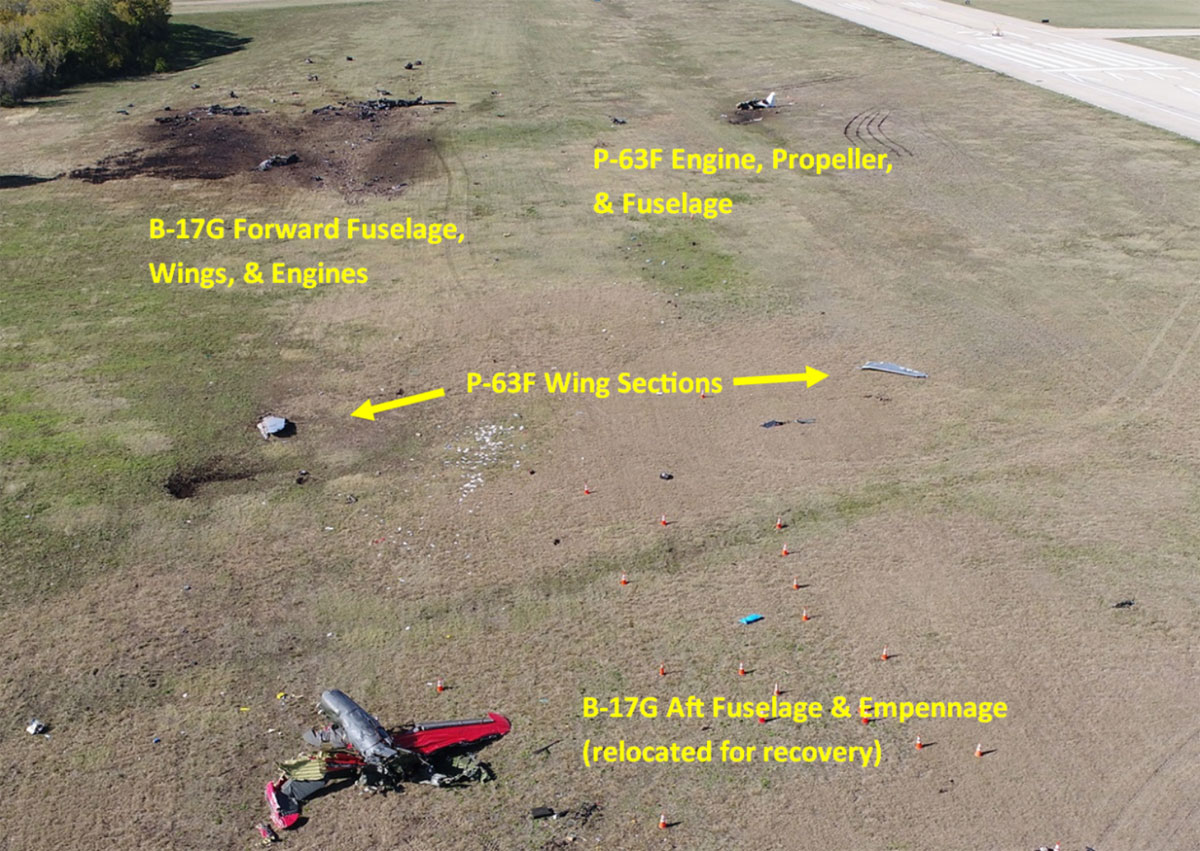 NTSB:n 30. marraskuuta julkistaman alustavan onnettomuustutkintaraportin mukaan onnettomuushetkellä esitysalueella ja esityslinjalla oli useita lentokoneita, jotka osallistuivat kyseiseen esityslentoon. Onnettomuuteen joutunut B-17G Flying Fortress oli johtokone kaikkiaan viiden historiallisen pommikoneen muodostelmasta. Toinen turmakone eli P-63F oli numero kolme yhteensä kolmen historiallisen hävittäjän muodostelmassa. Käydyn radiopuhelinliikenteen ja ADS-B-tietojen perusteella lentonäytösjohtaja (Air Boss) ohjeisti molemmat muodostelmat palaamaan Dallasin Executiven lentoaseman kiitotien lounaispuolelta takaisin esitysalueelle. Hävittäjien tuli siirtyä jonomuodostelmaan ja lentää pommikoneiden edellä noin 150 metrin päässä esityslinjasta ja pommikoneiden tuli lentää noin 300 metrin päässä esityslinjasta. Lentonäytöstä johtanut lentonäytösjohtaja Air Boss ei ollut ohjeistanut lentäjille ennen näytöstä erillisiä korkeusrajoituksia eikä niitä annettu myöskään esityslennon aikana. Hävittäjämuodostelman lähestyessä näytöslinjaa P-63F -hävittäjä oli kallistuneena vasemmalle, kun se törmäsi rajusti B-17G -pommikoneen runkoon siipilinjan taakse.