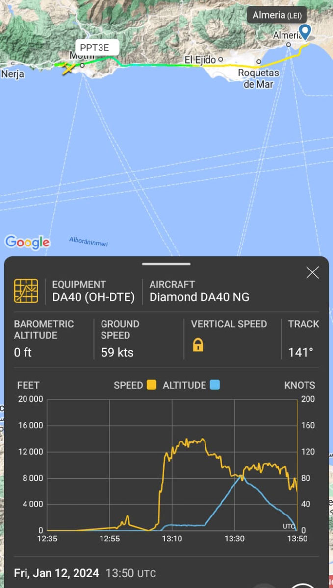 Patrian DA40 NG -koulukone (OH-DTE) oli lähtenyt matkalennolle Almeriasta ja määränpäänä oli kotikenttä Espanjan Córdobassa. Flightradar24-palvelun mukaan koulukone päätyi rannalle perjantai-iltapäivällä noin kello 15.50 Suomen aikaa.