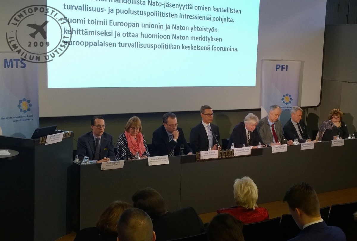 Puolustusministeriöön kuuluvan parlamentaarisen Maanpuolustustiedotuksen suunnittelukunnan (MTS) vaaliseminaari 25. helmikuuta täytti Kansallismuseon auditoriossa keräsi paikalle puolustuspolitiikan kovinta kärkeä: pääministeri Alexander Stubb (Kok), ulkoministeri Erkki Tuomioja (SDP) sekä puolustusministeri Carl Haglund (RKP). Lisäksi keskusteluun osallistuivat Eduskunnan puolustusvaliokunnan puheenjohtaja Jussi Niinistö (PS) sekä aihetta läheltä seuraavat kansanedustajat Seppo Kääriäinen (Kesk), Annika Lapintie (Vas), Pekka Haavisto (Vihr) ja Sari Palm (KD). Tilaisuuden moderoivat toimittajat Mirva Brola ja Reijo Lindroos.