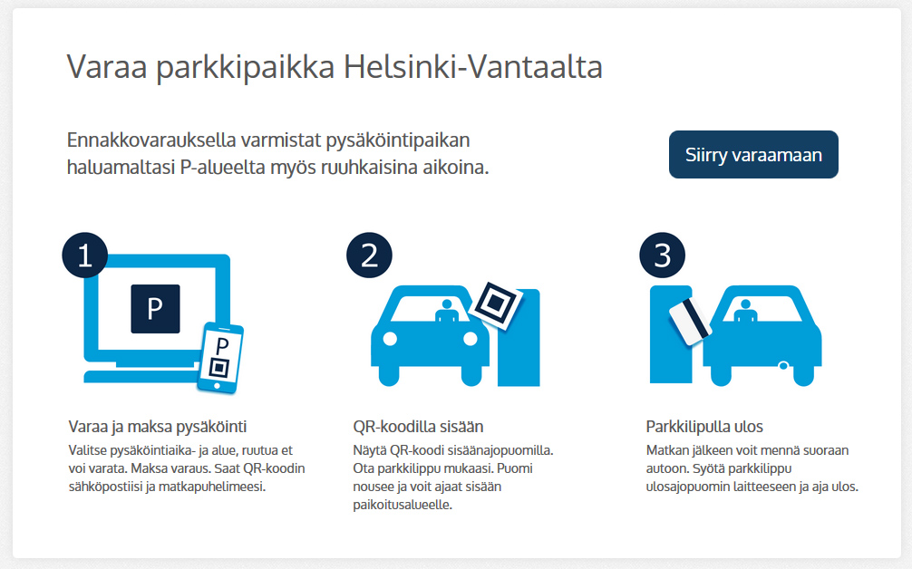 "Pysäköintipaikan varaaminen ja maksaminen Finavian nettisivujen kautta on ensimmäinen merkittävä etappi kohti sähköistä liiketoimintaa ja asiakasprosessien sähköistämistä", Haapasaari sanoo. Pysäköintiä tarjotaan sähköautoille myös latausmahdollisuudella. Lentoaseman P1-pysäköintitalossa avattiin tammikuussa 2014 neljä sähköautoille varattua paikkaa. Finavian lisäksi pysäköintiä ja kuljetuksia lentoaseman terminaaleihin tarjoaa myös Lentoparkki. Varaa: pysäköintipaikkasi Helsinki-Vantaalta Lentoposti.fi kertoi Finavian uudesta palvelusta 14. toukokuuta: