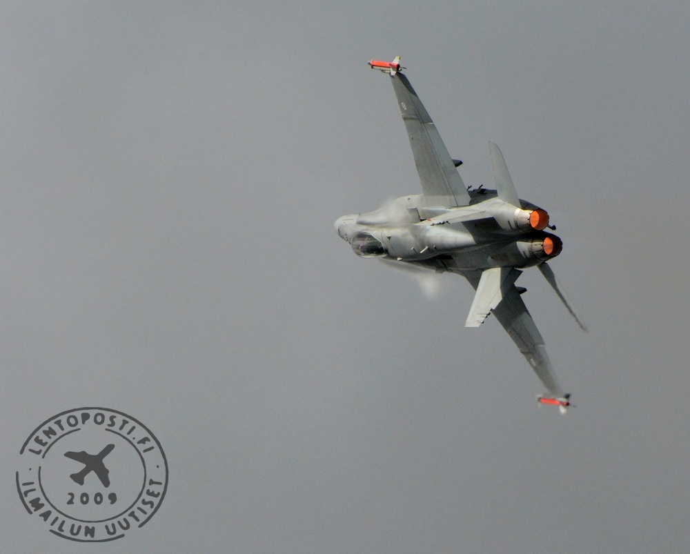 Melua pyrittiin välttämään sijoittamalla HN:n ohjelma mahdollisimman tarkasti kenttäalueen päälle. Tämä teki majuri Ville Hirvosen lentämästä esityksestä ainakin harjoituksessa jotenkin aiemmin nähtyjä kompaktimman ja helpommin seurattavan. Hävittäjä vaikutti silmämääräisesti myös olevan lähempänä yleisöä kuin yleensä. Harjoituslennolla käytössä ollut HN-426 ei vielä perjantaina laukaissut soihtuja, joita on lentonäytöskauden aiemmissa esityksissä nähty. Midnight Hawksin neljä BAE Systems Hawk -harjoitussuihkukonetta lensivät aiemmista kerroista poiketen niin, että esityslinja oli poikkikiitotien 09/27 suuntainen. Koneet vaikuttivat kuitenkin lentävän varsin korkealla ja kaukana (kuva alla).