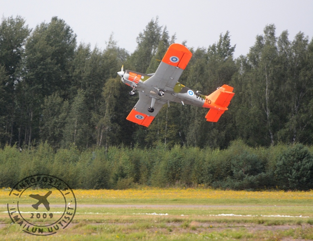 Ruotsalainen neljällä Saab Safir -koneella lentävä Team 50 harjoitteli perjantaina peräti kaksi kertaa (kuvassa yllä). Savuja käyttävän muodostelman mukavan letkeää lentämistä katseli mielellään uudelleenkin. Iltapäivällä oli vuorossa Ilmavoimien osuus. Kentän läheisyyteen oli jaettu runsaasti tiedotteita meluajankohdista. Sen seurauksena iltapäivän harjoitus keräsikin paljon katsojia kentälle ja oletettavasti myös sen ympäristöön.