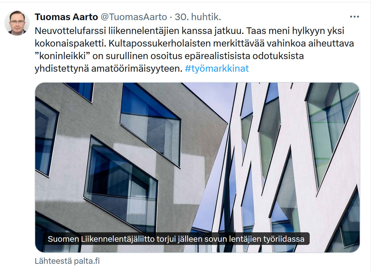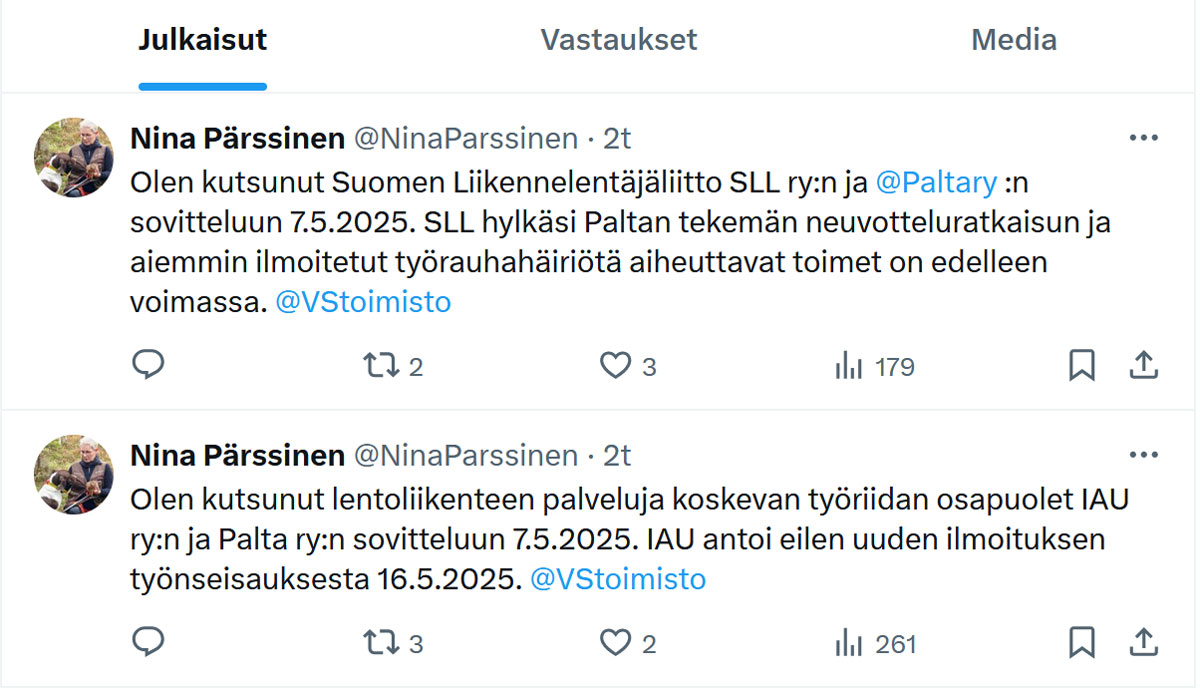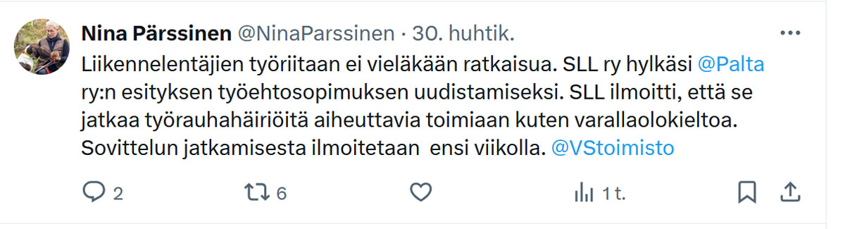 Sovittelija Pärssinen otti kantaa työriitaan X:ssä: "Liikennelentäjien työriitaan ei vieläkään ratkaisua. SLL ry hylkäsi Palta ry:n esityksen työehtosopimuksen uudistamiseksi. SLL ilmoitti, että se jatkaa työrauhahäiriöitä aiheuttavia toimiaan kuten varallaolokieltoa. Sovittelun jatkamisesta ilmoitetaan ensi viikolla".