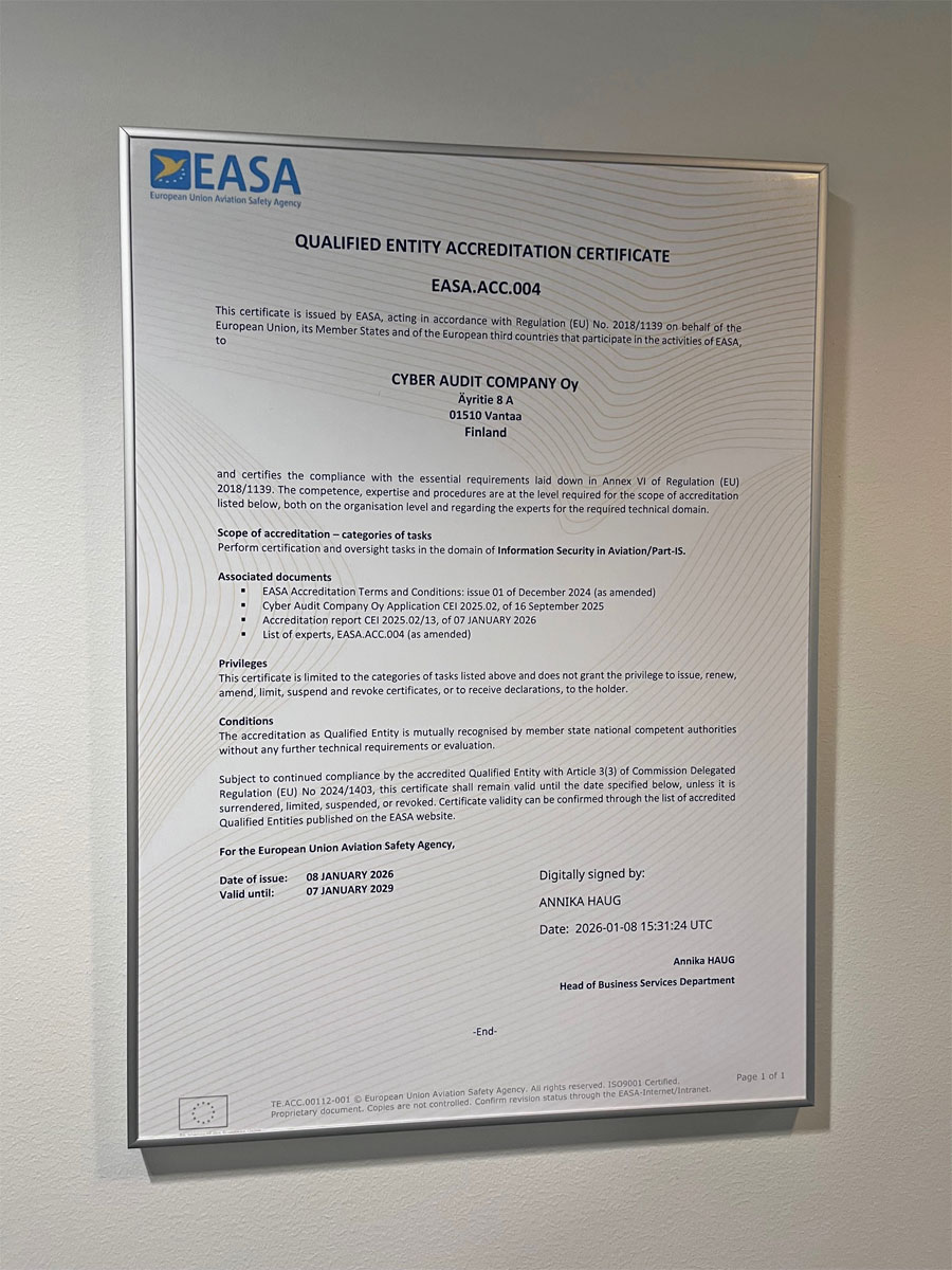 Cyber Audit Company suorittaa ilmailualan Part‑IS ‑auditointeja huolellisesti ja asiantuntevasti, täyttäen alan tiukat vaatimukset luoden uuden tason tietoturvalle ja kokonaisturvallisuudelle. EASA myönsi akkreditoinnin suomalaisyhtiölle tammikuussa 2026. Kyseessä on valtuutus, jolla voidaan suorittaa Euroopan unionin lentoturvallisuusviraston Part‑IS‑auditointeja. Yhtiön palvelutksessa toimivat ilmailun kyberturvallisuuden pioneerit Hugo Teso ja Benjamin Nagel, Suomen arvostettu IT- ja kyberturvallisuusasiantuntija Heikki Paananen sekä kokenut tietoturvan hallinnan johtaja Jarkko Rautula. Heitä tukee laajempi asiantuntijajoukko, jolla on syvällinen kokemus vaatimustenmukaisuudesta, riskienhallinnasta ja kyberturvallisuudesta.