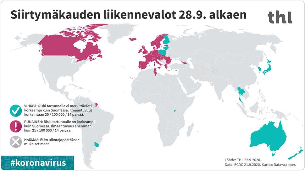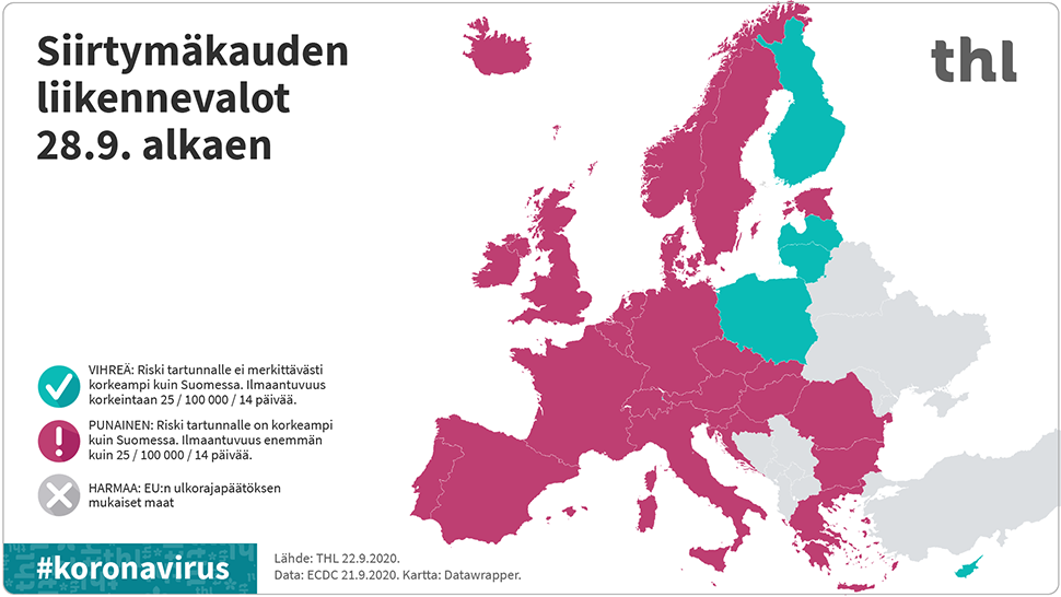 Suomi ottaa maahantulon rajoitukset uudestaan käyttöön Suomen ja Islannin, Norjan, Ruotsin, Saksan, Slovakian ja Viron välisessä liikenteessä sekä Georgian, Kanadan ja Tunisian asukkaille, jotka matkustavat kotimaastaan Suomeen. Rajoitukset poistuvat San Marinosta Suomeen saapuvasta liikenteestä. Edelleen mahdollista on päivittäinen liikenne Suomen, Ruotsin ja Norjan välisellä maarajalla rajayhteisöjen välillä. Lisäksi maanantaista 28.9. alkaen Suomessa voi käydä työssä Ruotsista ja Virosta ilman omaehtoista 14 vuorokauden karanteenia. Jatkossa maalistaus voi muuttua aina viikoittaisen tarkastelun myötä. Maahantulon rajoitusten muutokset tehdään Terveyden ja hyvinvoinnin laitoksen (THL) asiantuntija-arvion perusteella kunkin maanantain tietojen perusteella. Raja-arvoa 25 uutta tautitapausta 100 000:ta henkilöä kohden edellisen 14 päivän aikana sovelletaan EU- ja Schengen-maihin sekä EU-neuvoston määrittelemiin ns. Vihreän listan maihin. Mahdollisista muutoksista päätetään torstaisin valtioneuvoston istunnossa. Myös THL:n matkailijoille suuntaa antava ns. liikennevalomalli on päivitetty 28.9. alkavaan aikaan ja punaisia maita on entistä enemmän.