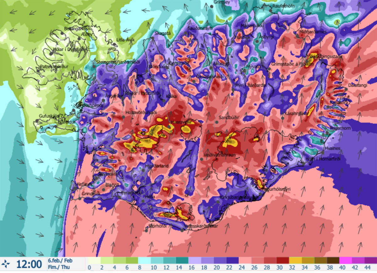 Islannin ilmatieteen laitoksen mukaan etelätuulen nopeus on 20-28 m/s ja paikoittain puuskat ovat jopa yli 40 m/s. Keskiviikkoillalle on luvassa 28-33 m/s tuulta eli 100-120 km/h nopeudella puhaltavaa ilmavirtaa.
