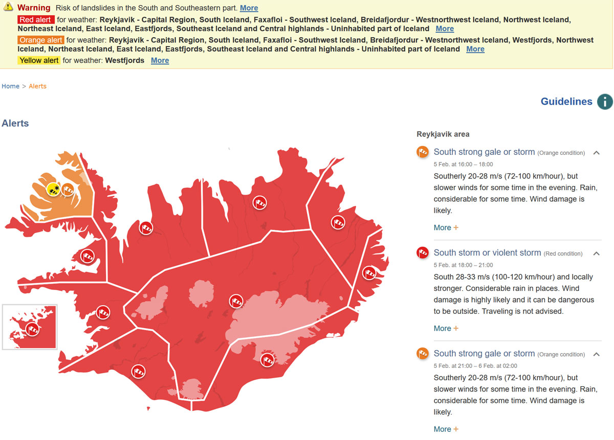 Säävaroitukset on annettu Reykjavikin alueella, Etelä-Islantiin sekä Faxaflói Bayn ja Breiðafjörðurin alueille voimakkaan ja puuskittaisen etelä- ja lounaustuulen takia. Pahimpien tuulten odotetaan hellittävän torstaina kello 14.00 paikallista aikaa.
