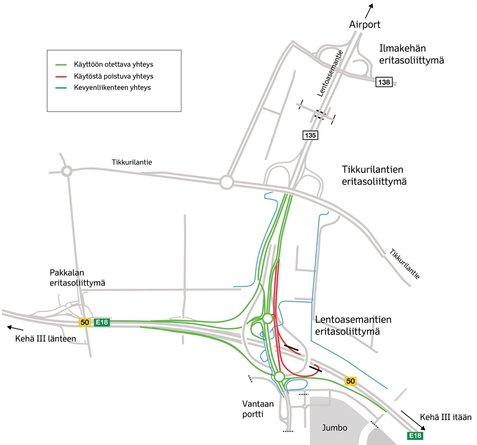Käyttöön otetaan uusi ramppi Lentoasemantieltä Kehä III:lle länteen sekä Lentoasemantien uudet bussipysäkit. Lentokentälle pääsee vaivattomasti myös Ilmakehän tai Tikkurilantien kautta. "Liikennejärjestelyt ovat välttämättömiä, jotta nyt liikenteellä oleville alueille päästään rakentamaan uusia rakenteita. Liikennejärjestelyistä osa on pysyviä ja osa käytössä vain rakennustöiden ajan, kunnes uusia ramppeja saadaan valmiiksi", kertoo projektipäällikkö Antti Koski Liikennevirastosta. Työt jatkuvat talven ja kevään aikana Kehä III:n keskeneräisten ramppien ja niillä olevien siltojen parissa. Lisäksi eritasoliittymän alueelle rakennetaan uusia valaistusrakenteita.