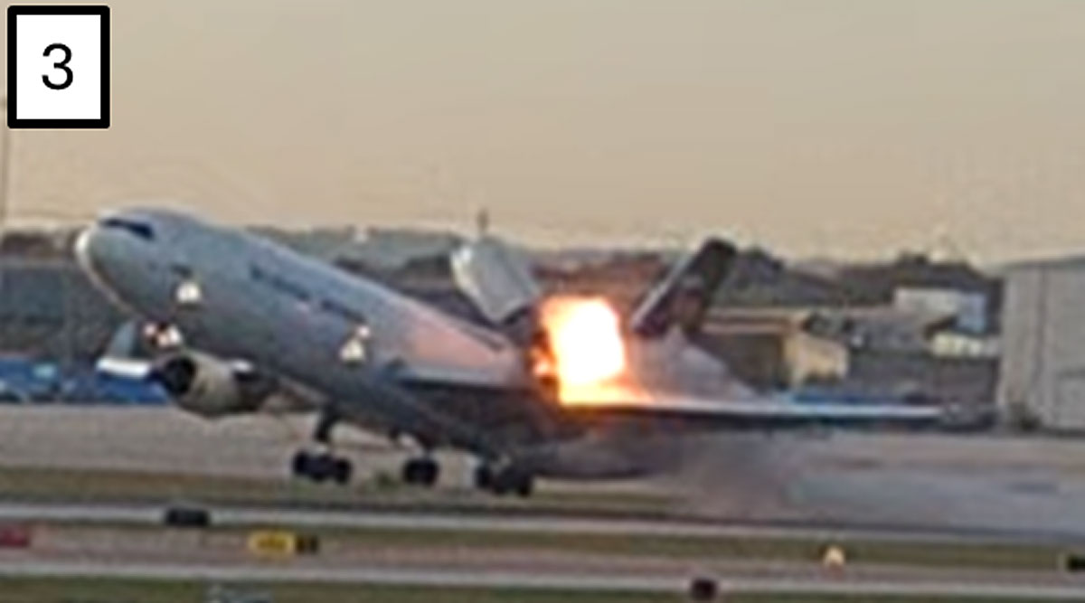 Kuvasarjasta näkyy kuinka MD-11F -rahtikone on jo nousussa, kun sen moottori ja moottoripankka irtoavat ensin taaimmaisista kiinnikkeistä. Koneen CF6-moottori antaa edelleen hetken aikaa työntövoimaa, kun käytössä on vielä polttoainetta. Moottori nousee ylöspäin ja repien etummaiset kiinnikkeet irti. Moottori ja siipi syttyvät tuleen.