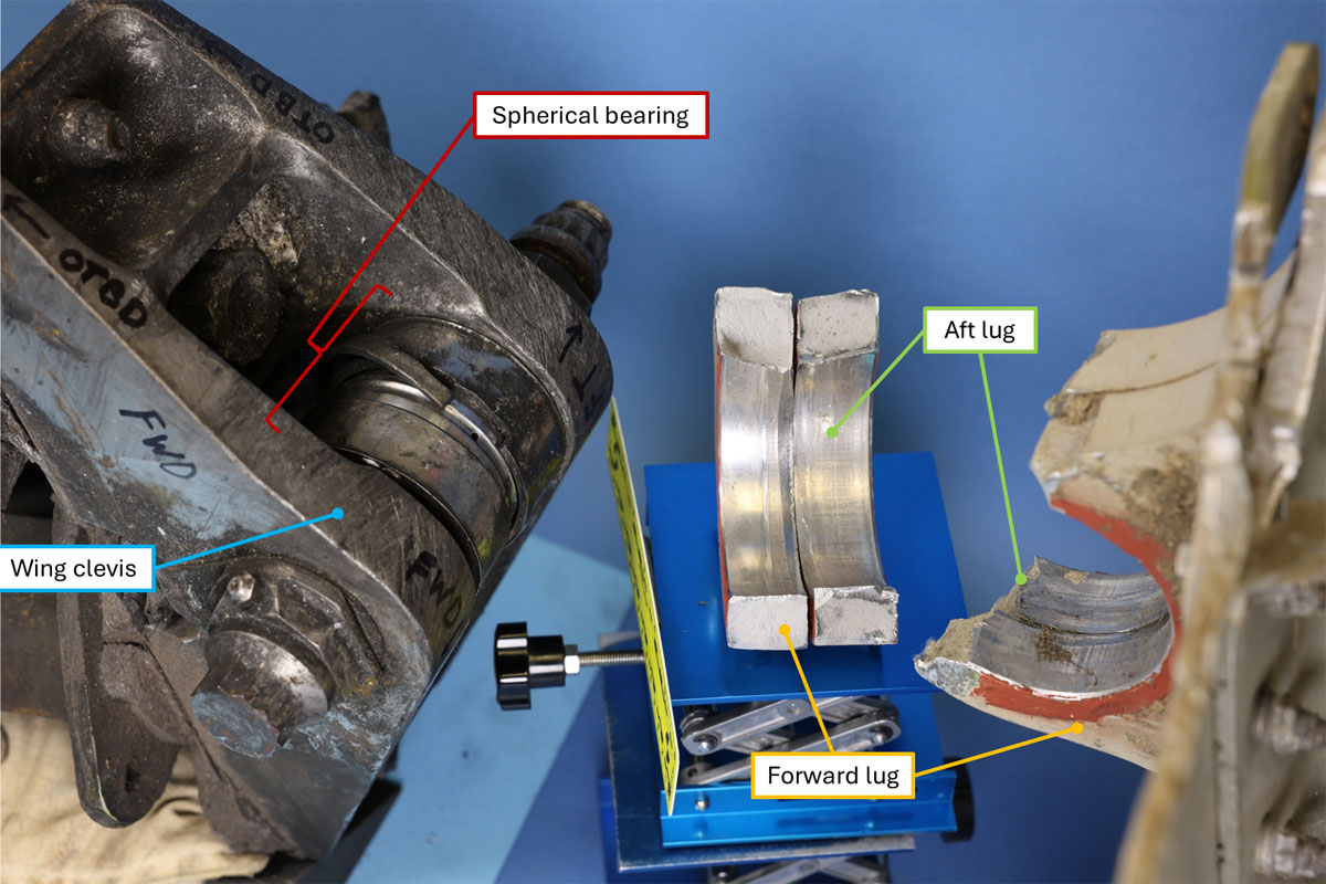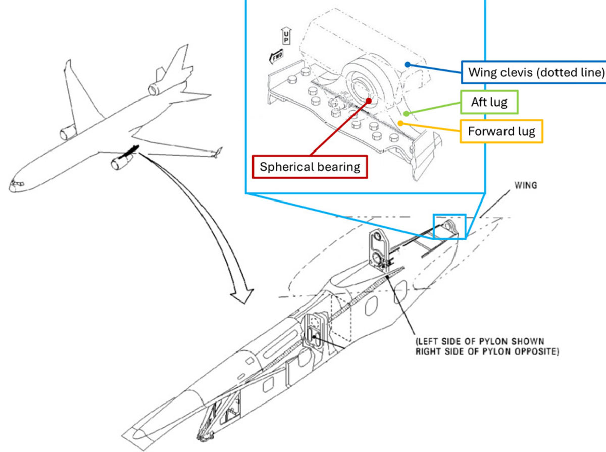 MD-11F -koneen molempien siipimoottoreiden kiinnitykseen liittyvät osat NTSB:n laboratoriossa tutkittavina. Alustavien tutkimusten mukaan vasemman moottoripankan takakiinnikkeissä on löytynyt todisteita rasitusmurtumista.