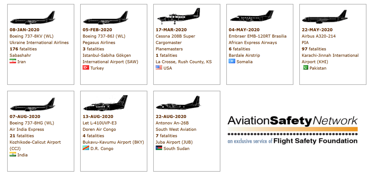 Vuonna 2020 tapahtui kaikkiaan kahdeksan kuolemaan johtanutta lentoturmaa kaupallisen ilmakuljetuksen piirissä matkustaja- tai rahtilennoilla. Niissä menehtyi kaikkiaan 314 ihmistä, joista yksi menehtyi ns. kolmantena osapuolena eli maassa. Vuotta aiemmin eli 2019 kuolemaan johtaneita lentoturmia tapahtui 20 ja niissä menehtyi 283 ihmistä. Tilastojen valossa vuosi 2020 oli turvallisempi kuin mikään aiempi ilmailuvuosi kuolemaanjohtaneiden lentoturmien määrässä mitattuna suhteutettuna lentomäärään. Syynä on koronaviruspandemian leikkaamat lentomäärät, joissa on ollut edellisvuoteen verrattuna pudotusta noin 50 prosenttia. Flightradar24-lennonseurantapalvelun mukaan vuoden 2020 kokonaislentomäärät olivat 49 918 704 ja laskua edellisvuoteen oli 27 prosenttia. Kaupallisen ilmakuljetuksen osalta pudotus oli dramaattisempi 47 prosenttia ja kokonaislentomäärä oli näiltä osin vain 24 435 753 lentoa, kun vuotta aiemmin lentomäärä oli 41 966 678. Vuoden 2020 lentomäärät ovat vastaavat kuin 20 vuotta aiemmin. Aviation Safety Networkin mukaan vuonna 1999 lentoturmia tapahtui 43 eli lentomäärään suhteutettuna vuosi 2020 oli merkittävästi turvallisempi ja osoittaa sen mukaan lentoturvallisuustyön tärkeää roolia 20 vuoden ajalta. Kahdeksasta vuoden 2020 lentoturmasta neljä tapahtui suurelle suihkumatkustajakoneelle, joista kolme tapausta sattui Boeing 737 -koneille ja yksi Airbus A320-koneelle. Lentoturmista yksi tapahtui Yhdysvalloissa, yksi Euroopassa ja loput kuusi Lähi-idässä, Afrikassa ja Aasiassa.