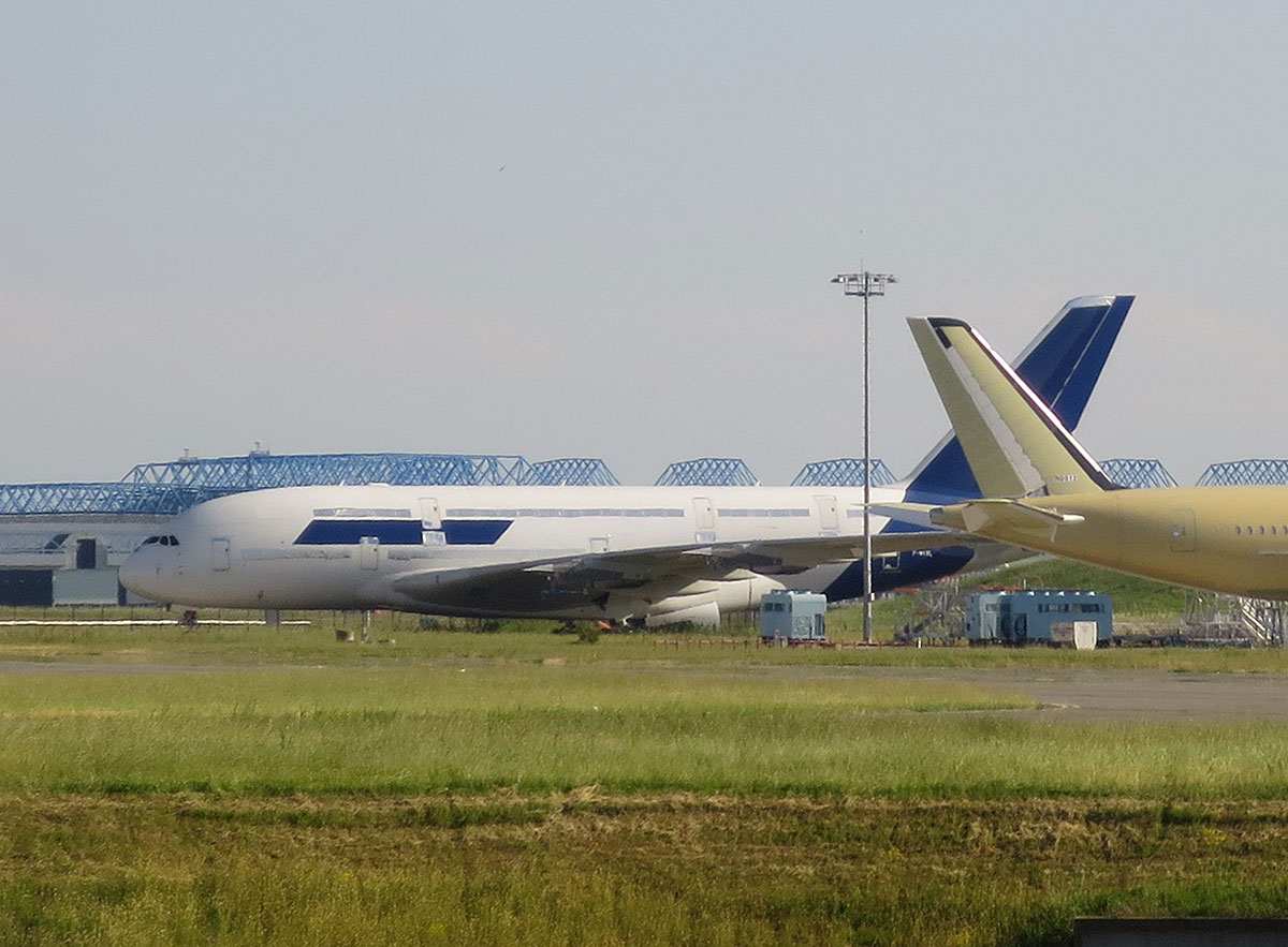 Toulousessa sijaitsevan A380 FAL:n eli kokoonpanolinjaston edessä seisoo useampi jättikone. Emiratesin ja British Airwaysin koneyksilöiden lisäksi siellä on myös kaksi Skymarkin perumaa konetta sekä yksi peruuntunut VIP-versio. Ne ovat kaikki nykyisin ns. bluetail-koneita eli toistaiseksi ilman omistajaa.