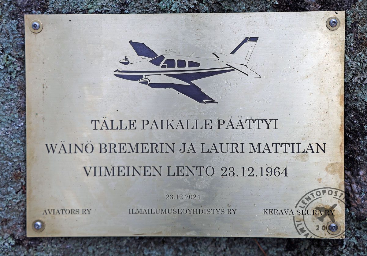 ”Haluamme muistaa myös Bremerin ystävää Lauri Mattilaa, joka jakoi saman innokkuuden ilmailua kohtaan. Valitettavasti heidän kohtalonsa kietoituivat traagisesti yhteen tällä paikalla lento-onnettomuuudessa 23.12.1964”.