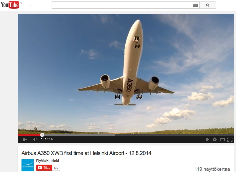 Finavian Mika Ajomaan kuvaamassa videossa kameroita on sijoitettu mm. Follow Me -ajoneuvoihin sekä useaan paikkaan koneen rullausreitin varrella. Komein näkymä on suoraan kiitotien 22L finaalin alle sijoitetusta kamerasta. Videolta voi nähdä, miten ns. Lemminkäisen kallioille kiitotien päähän on kerääntynyt poikkeuksellisen runsaasti katsojia seuraamaan koneuutuuden ensivierailua. Vastaavia yleisömassoja kuin Airbus A380 -superjumbon saapuessa syyskuussa 2010 ei kuitenkaan nähty (lue juttu tapahtumasta: A380 ruuhkautti lentoaseman ympäristön). Luonnollisesti mukana on myös raskaiden Rosenbauer Panther -pelastusajoneuvojen vesisuihkuillaan tekemä perinteinen saapumistervehdys. Lue myös Lentoposti.fi -juttuja aiheesta: Finnairin tuleva laajarunkokone A350 XWB saapui Helsinki-Vantaalle Komposiittirakenteinen A350 XWB tuo uuden ympäristön lentäjille ja lisää tilaa matkustajille Finnair varustaa uudet A350XWB -koneet 297 matkustajaistuimella Finnairin ensimmäiset A350-kohteet julki