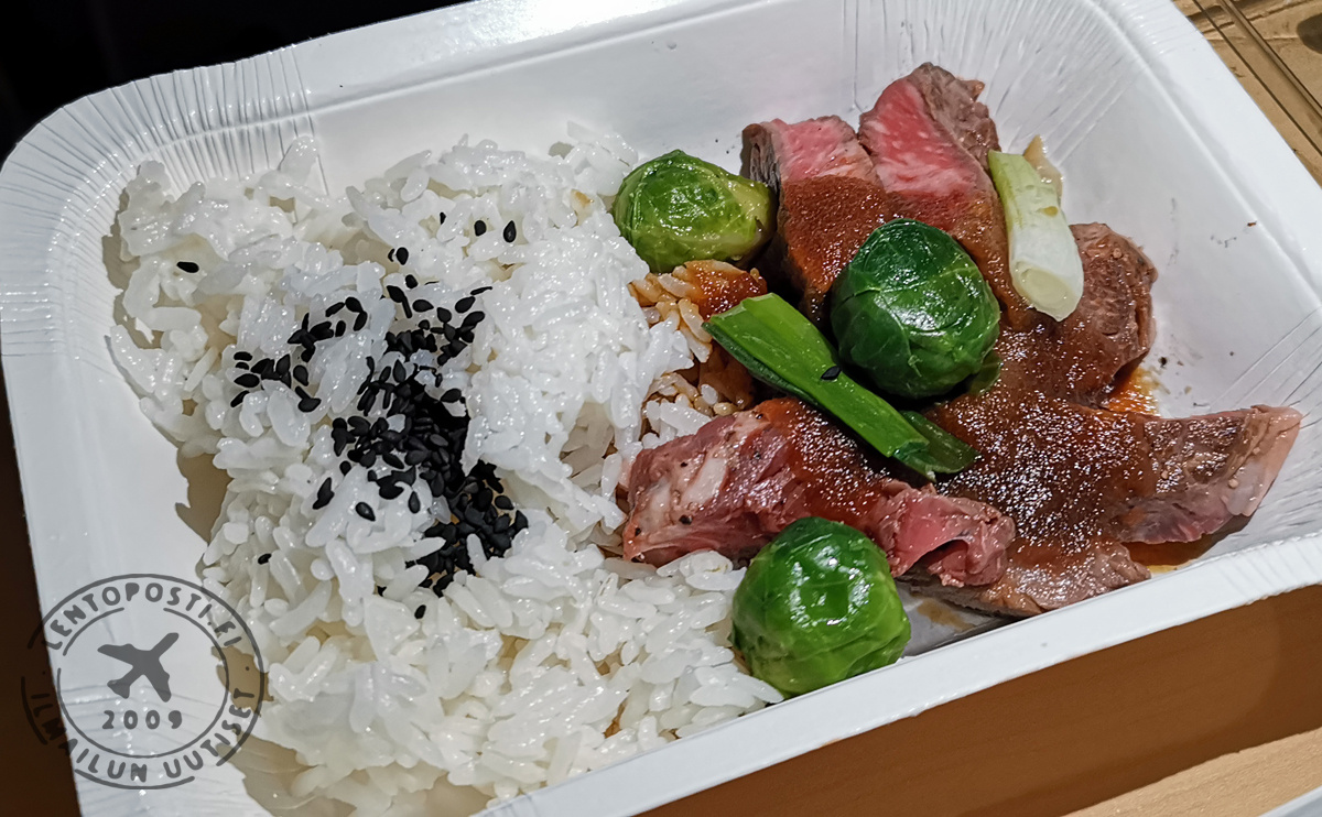 Teriyakihärkäannoksen liha oli maukasta ja laadukasta. Makeaksi paistetut sipulit täydensivät hyvän kastikkeen makua, jota olisi kuitenkin kaivannut annokseen hieman enemmän tarjolla olevaan riisimäärään nähden. Ruusukaalit olivat täydellisen napakoita.