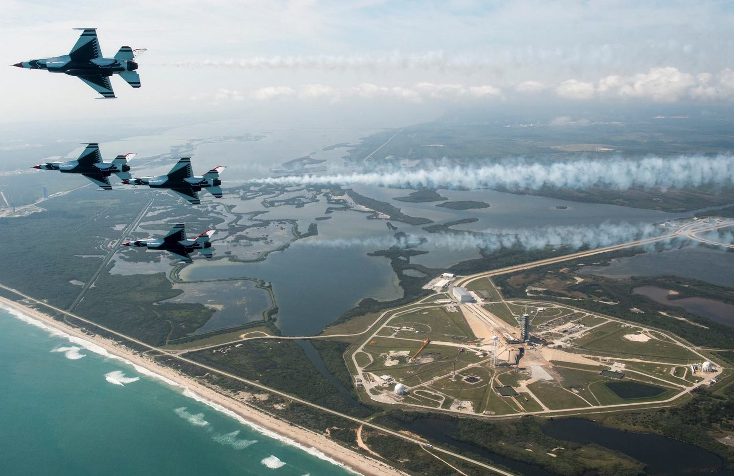 Thunderbirdsien Lockheed Martin F-16 Fighting Falcon -hävittäjät tekivät Aldrinin kanssa ylilennon myös Kennedy Space Centerissä Floridassa. Sen laukaisualustalta LC-39A (oikealla, klikkaa kuvat suuremmaksi) Apollo 11 -lennon Saturn V -kantoraketti nousi historialliselle matkalleen kohti kuuta 16. heinäkuuta 1969. Nykyisin alustaa käyttää SpaceX-yhtiö uudelleen käytettävien Falcon 9 -rakettiensa laukaisuihin (lue lisää linkistä jutun lopussa). Aldrin lensi hävittäjäohjaajana Korean sodassa ja sai kaksi ilmavoittoa MiG-15-hävittäjistä F-86 Sabrellaan. Kylmän sodan aikana Aldrin päivysti Länsi-Saksassa F-100 Super Sabrella.