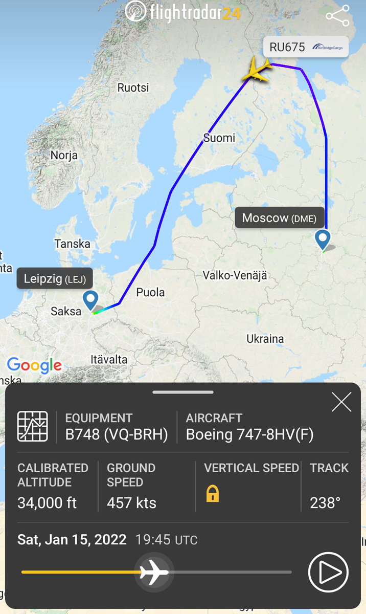 AirBridgeCargo Airlinesin Boeing 747-8F -rahtikoneen (VQ-BRH) lauantaina 15. tammikuuta operoima lento on herättänyt paljon erilaisia tulkintoja ja spekulaatioita suomalaisessa mediassa. Suomen ilmatilassa liikkuvan koneen on jätettävä siviili-ilmailun lentoliikennettä ohjaaville ja Suomen ilmatilan käyttöä koordinoiville lennonvarmistuselimille lentosuunnitelma. Se sisältää muun muassa tiedon lennon lähtöpaikasta, reitistä, määränpäästä ja aikataulusta.